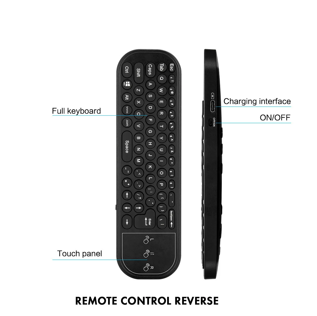 3.Modo de control: hay dos modos de control del mouse, la superficie del control remoto es un giroscopio air flymouse y la superficie del teclado es un mouse con panel táctil.
