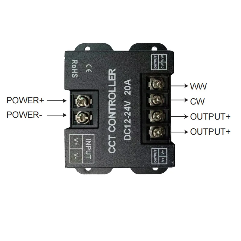 Controlador de temperatura de doble color 20A. El controlador de temperatura de color dual adopta tecnología de control PWM avanzada para controlar varias tiras de luz CCT de voltaje constante, utilizadas principalmente para ajustar iluminación LED de un solo color/tiras de luz, y tiras de luz de un solo color 5050 3528.