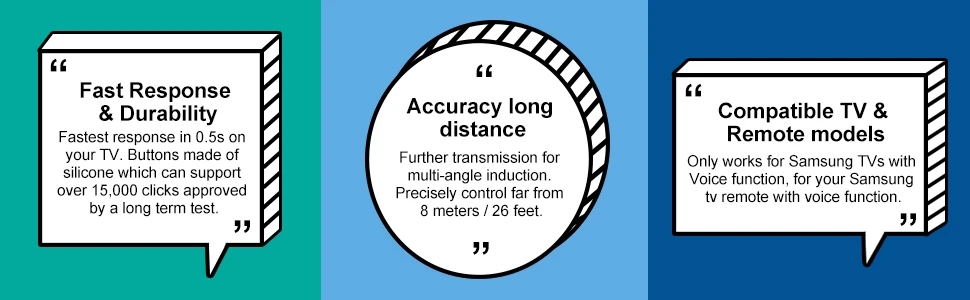 【Distancia remota】El mando a distancia de reemplazo para Samsung TV admite tecnología infrarroja y Bluetooth, no modelo RF (radiofrecuencia). Los botones se han probado para admitir 5.000-8.000 clics en cada botón, y la respuesta más rápida en 8 metros y también disponible en unos 10 metros. ��