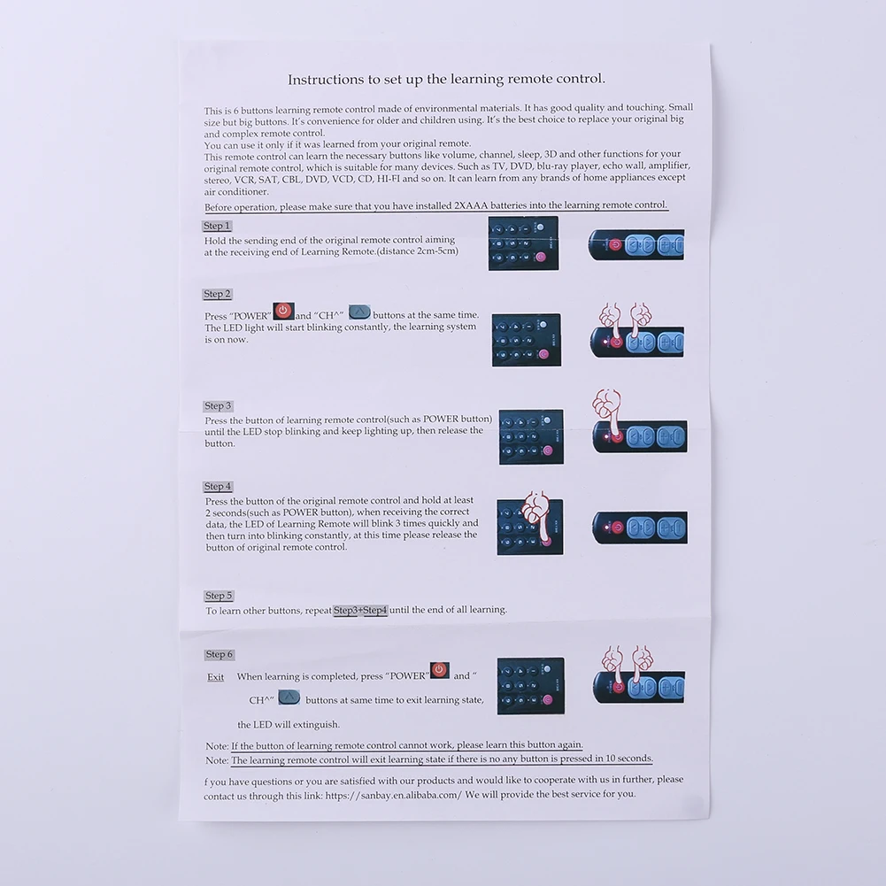 Control remoto de aprendizaje, copia de 6 botones grandes, control remoto IR, accesorios electrónicos para hogar inteligente, Control remoto de televisión Universal para TV DVD STB DVB HIFI Característica: 1. Configuración remota de aprendizaje sin esfuerzo: programar fácilmente el control remoto de aprendizaje con instrucciones simples, permitiendo que controlar múltiples dispositivos sin complicaciones de mandos a distancia. 2.Experiencia de control remoto de aprendizaje sin costuras: consolida todos sus accesorios electrónicos para el hogar inteligente en un dispositivo fácil de usar para mejorar la comodidad y la eficiencia. 3.Compatibilidad universal con control remoto de televisión: nuestro control remoto de televisión universal funciona con la mayoría de las marcas de televisión, garantiza que tener el poder para comerar su tecnología. 4. Características del controlador inteligente: Disfruta los beneficios de la funcionalidad avanzada con nuestro controlador inteligente, diseñado para simplificar el sistema de entretenimiento en el hogar. 5. Diseño apto para el usuario: el diseño intuitivo y el diseño ergonómico hace que el control remoto de aprendizaje cómodo de usar, incluso durante las sesiones de visualización extendidas. Especificaciones: Gama de emisiones: más de 10 m, Ángulo de emisión: 40°-45° Color: negro Richie 2 pilas AAA (no incluidas) Descripción: Se utiliza para aprender programas desde cualquier control remoto por infrarrojos y luego tienen las mismas funciones del original.Puede copiar todos para STB / DVD / VCR / SAT / HIFI / DVB.... controles remotos de todos los controles remotos por infrarrojos como para Samsung, forLG, forPhilips, forHitachi, forKonka, etc. Esto es un control remoto de aprendizaje puro de 6 teclas. Antes de usar, debe estudiar y aprender el control remoto original antes de usarlo. Control remoto del aire acondicionado, el control remoto del ventilador no puede aprender. TV, amplificador, reproductor, decodificador, STB/DVD/VCR/HIFI/DVB estos controles remotos originales se pueden aprender