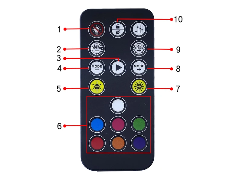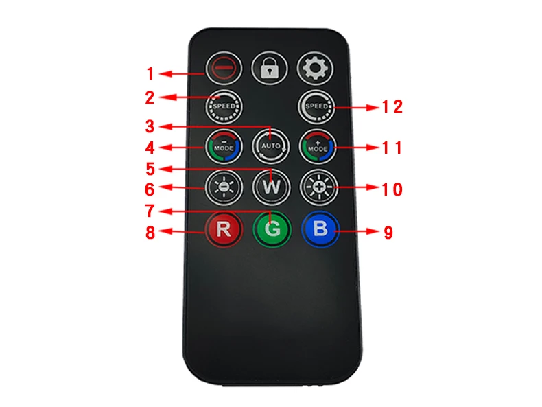 10: Lock button, (press once to flash the white light once to lock the current remote control, press again to flash the white light once to unlock, lock the remote control, other remote controls are invalid, press the lock button to automatically turn onwhen in the shutdown state, and return to the mode before