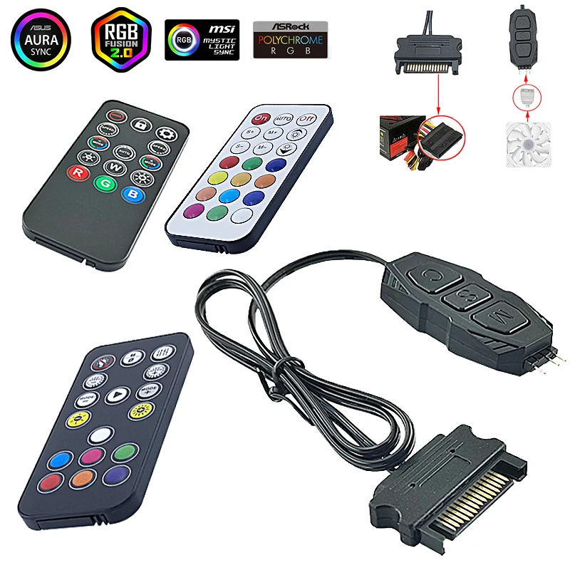 Comprar Controlador ARGB de 5V y 3 pines a Mini controlador remoto SATA RGB, adaptador HUB, mando a distancia RGB para ventilador de PC, tira de luz de ventilador de refrigeración