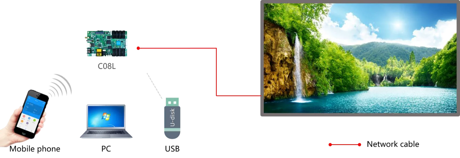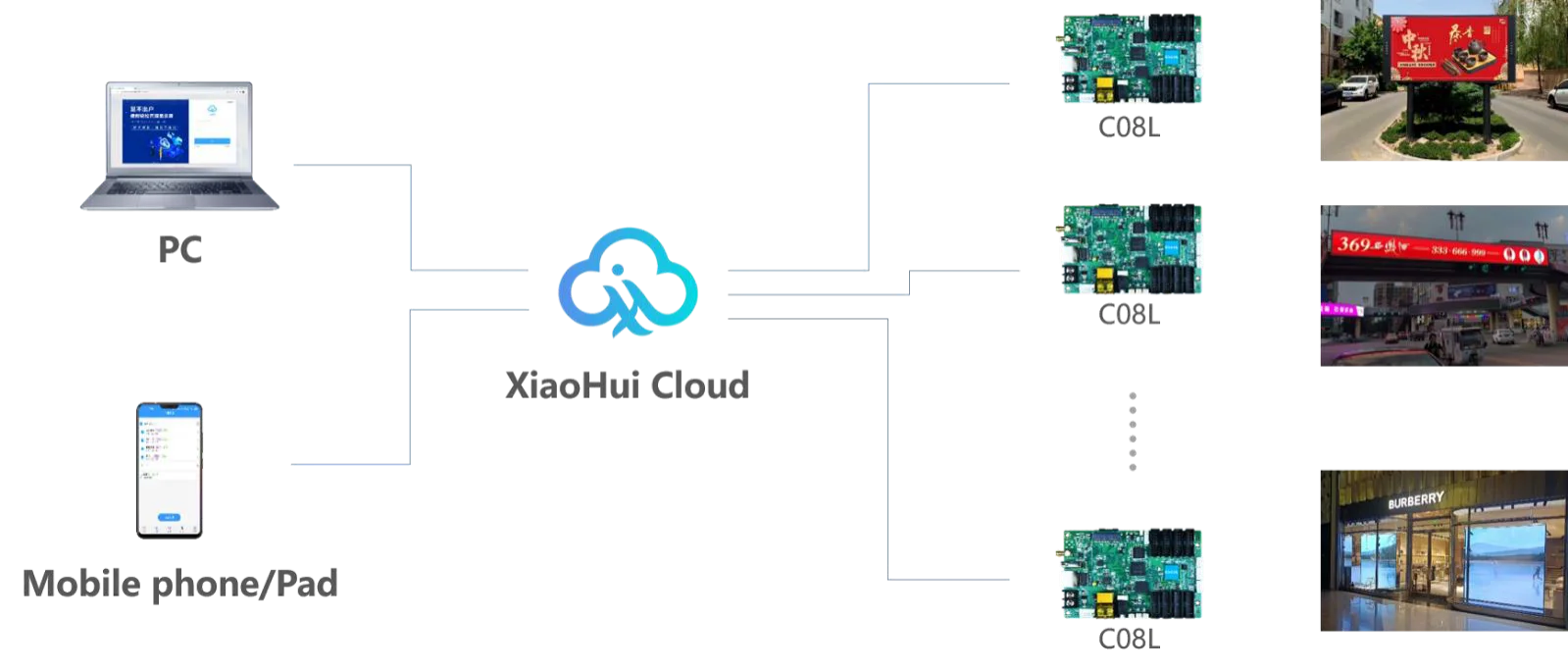 C08L viene de serie con Wi-Fi y admite aplicación móvil - control inalámbrico "LedArt";Admite acceso a la plataforma "XiaoHui Cloud" para realizar fácilmente la gestión remota de clúster en Internet;Admite interfaz USB para actualizar programas;Admite varios sensores externos de monitoreo ambiental, logrando una visualización en tiempo real de los datos de monitoreo ambiental;C08L se usa ampliamente en pantallas comerciales inteligentes y campos de ciudades inteligentes, como pantallas de postes de luz, pantallas de puertas, pantallas de vehículos y otros campos de publicidad y visualización.