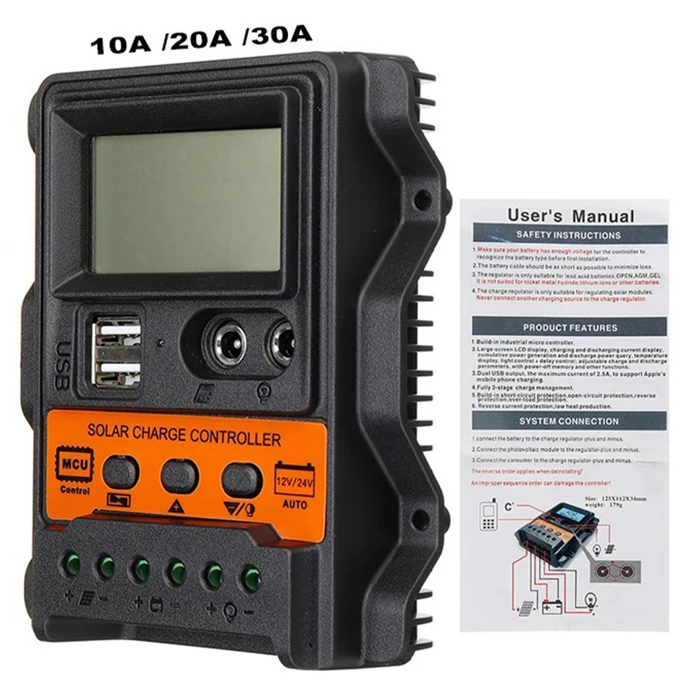 Controlador de carga Solar 10A/20A/30A, controlador PWM de corriente de salida Dual USB 5V 2.5A, PWM de 3 etapas para Panel Solar, batería de plomo y ácido