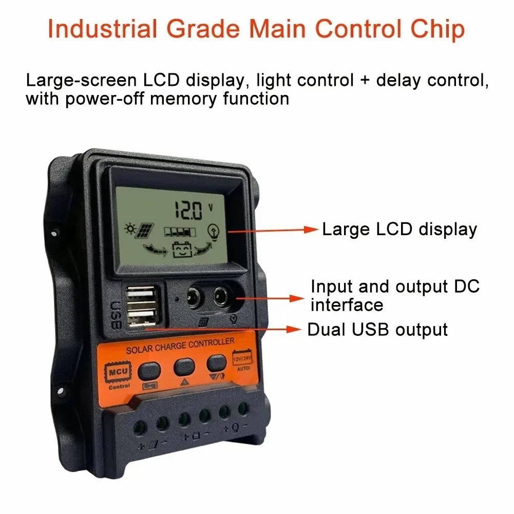 1.Compatibilidad versátil:Este controlador de carga solar admite sistemas de 12 V y 24 V, gestionando automáticamente el funcionamiento de paneles solares y baterías con un microcontrolador industrial avanzado.