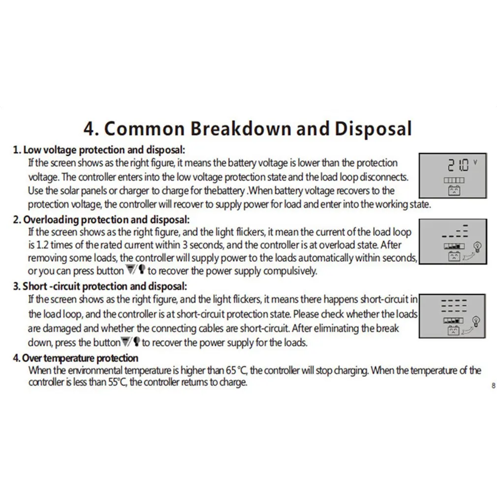 4. Sobrecarga, protección contra cortocircuitos; Protección de descarga inversa de la batería; Desconexión de bajo voltaje de la batería (LVD); Protección de conexión inversa de la batería.