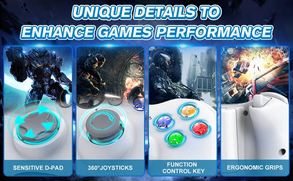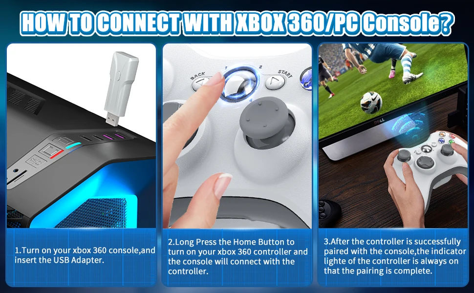 Este producto es un controlador inalámbrico que se puede utilizar en la plataforma host XBOX360.Compatible con varias funciones de control del controlador inalámbrico Bluetooth XBOX360 de Microsoft.Se puede utilizar en el sistema Windows XP, VISTA, Windows7 y Windows10 no es necesario instalar controladores.Cuando se inserta el mango, la computadora instalará automáticamente el controlador.