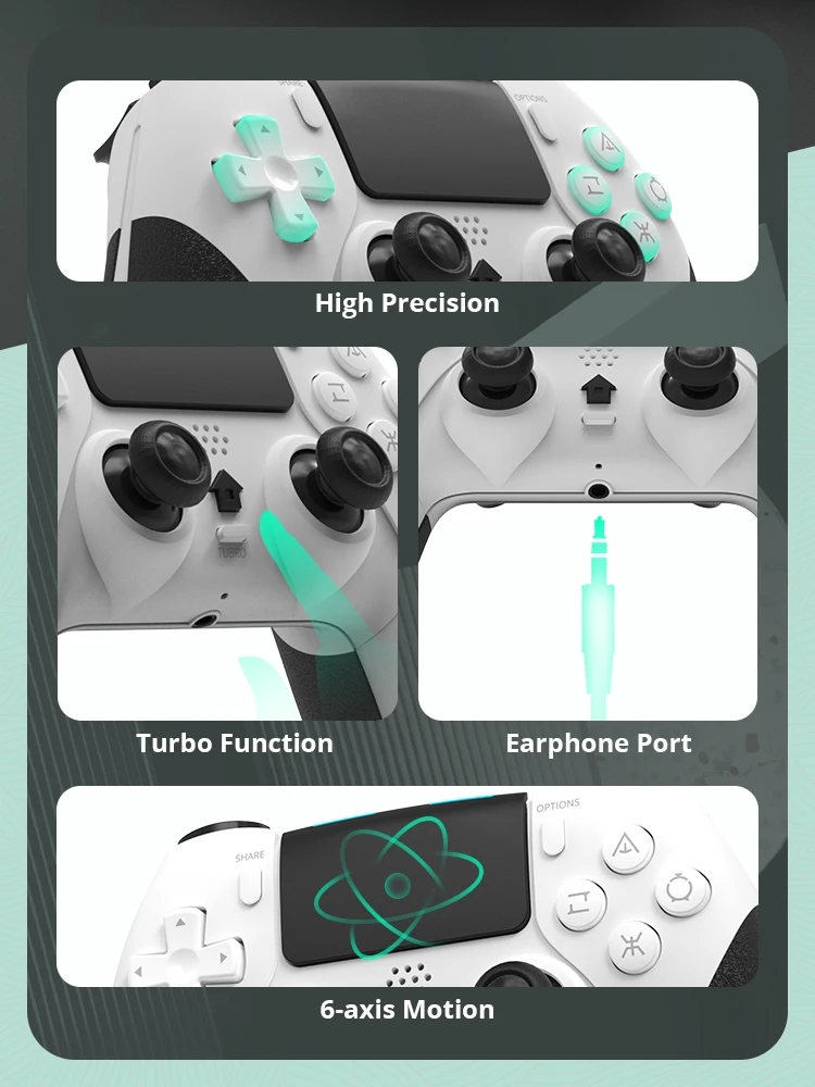 Este controlador tiene una almohadilla táctil altamente sensible, vibración dual, función turbo, sensibilidad a la gravedad, sensor de movimiento de 6 ejes y otras funciones compatibles para una experiencia completamente inmersiva. El botón de compartir proporciona una manera emocionante de experimentar su juego y compartir sus mejores momentos sin perder cada momento de juego maravilloso.