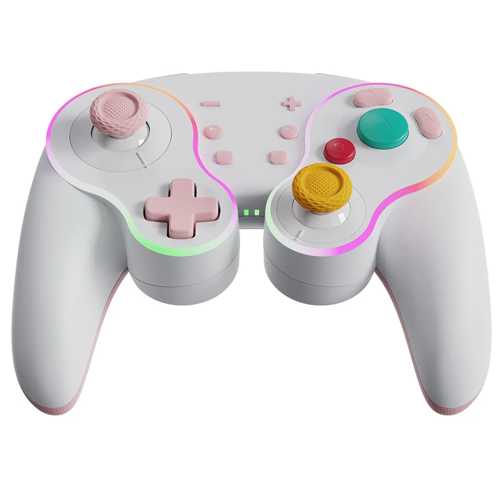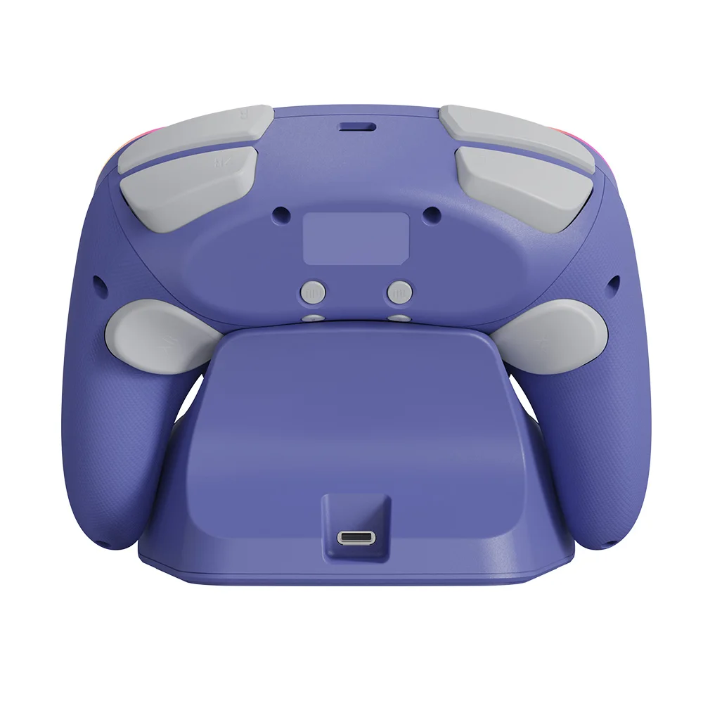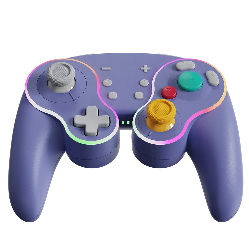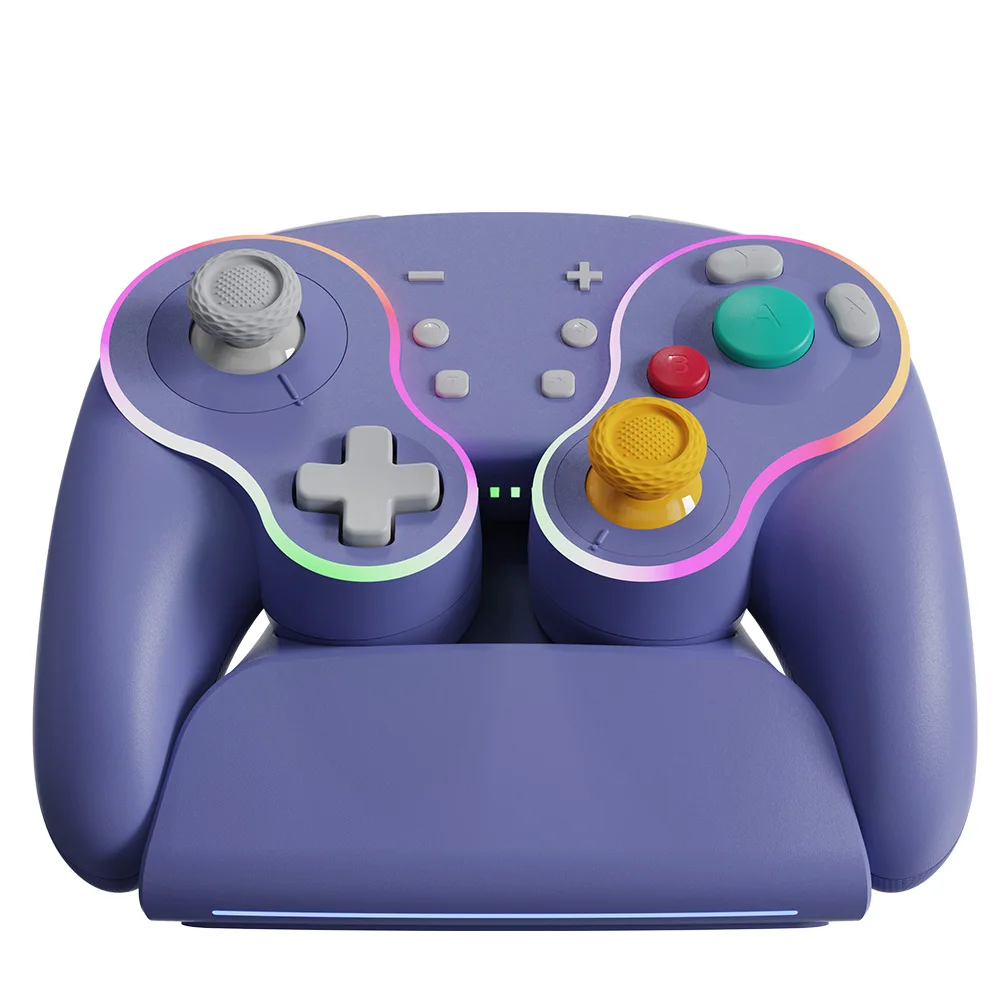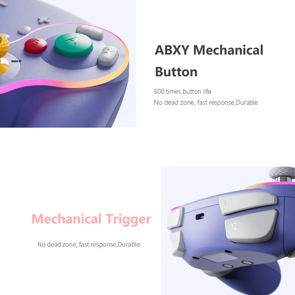 Está hecho de manera similar al pad de cubo, por lo que es bonito. La luz entra alrededor del área del palo y el botón, lo que lo hace colorido y bonito. El tacto de la tecla es muy mecánico, lo cual me gusta. El gatillo no es solo para L1 y R1, sino también para L2 y R2. No es genial para juegos de carreras, pero es bueno verlo como un pad para switches. Es barato y viene con cables de carga, por lo que la relación costo-efectividad es muy buena. Elegí pensando que el púrpura era el color base, pero es un poco diferente del color de firma real del cubo.