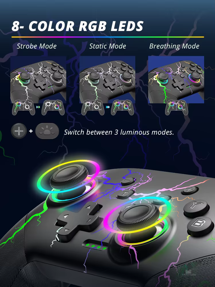 Los joysticks de nuestro controlador de interruptor inalámbrico está diseñado con 8 colores de luz y 1 luz LED RGB arco iris. El cambio de tres modos de iluminación le brinda una experiencia de juego diferente.