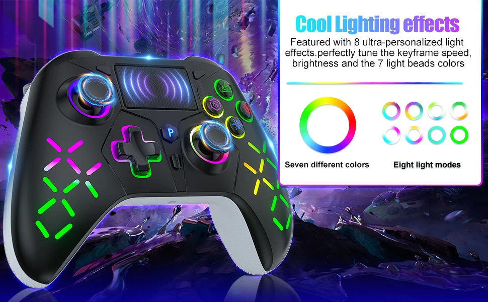 【Changeable RGB Multicolor Buttons】Press the L3+R3 button for 3s. The p5 controller wireless will vibrate for 1s, indicating that the light color can be change. Press and hold the SET+R3 together to switch the lighting effect mode (Colorful - Monochrome - Colorful Transformation - Monochrome Breathing).