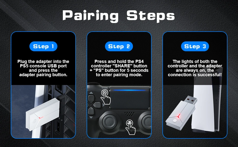 【Controller Compatibility】Lapezei controller adapter supports P4/P5 Controller,easily converts our P4 controller to P5 console, and the original P4 controller also works.The matching method is also very simple.First,short press the pairing button of adapter.Then,press and hold "SHR"key,and then press and hold the "P" key for 5s.Finally press the "P"key again to complete the connection.