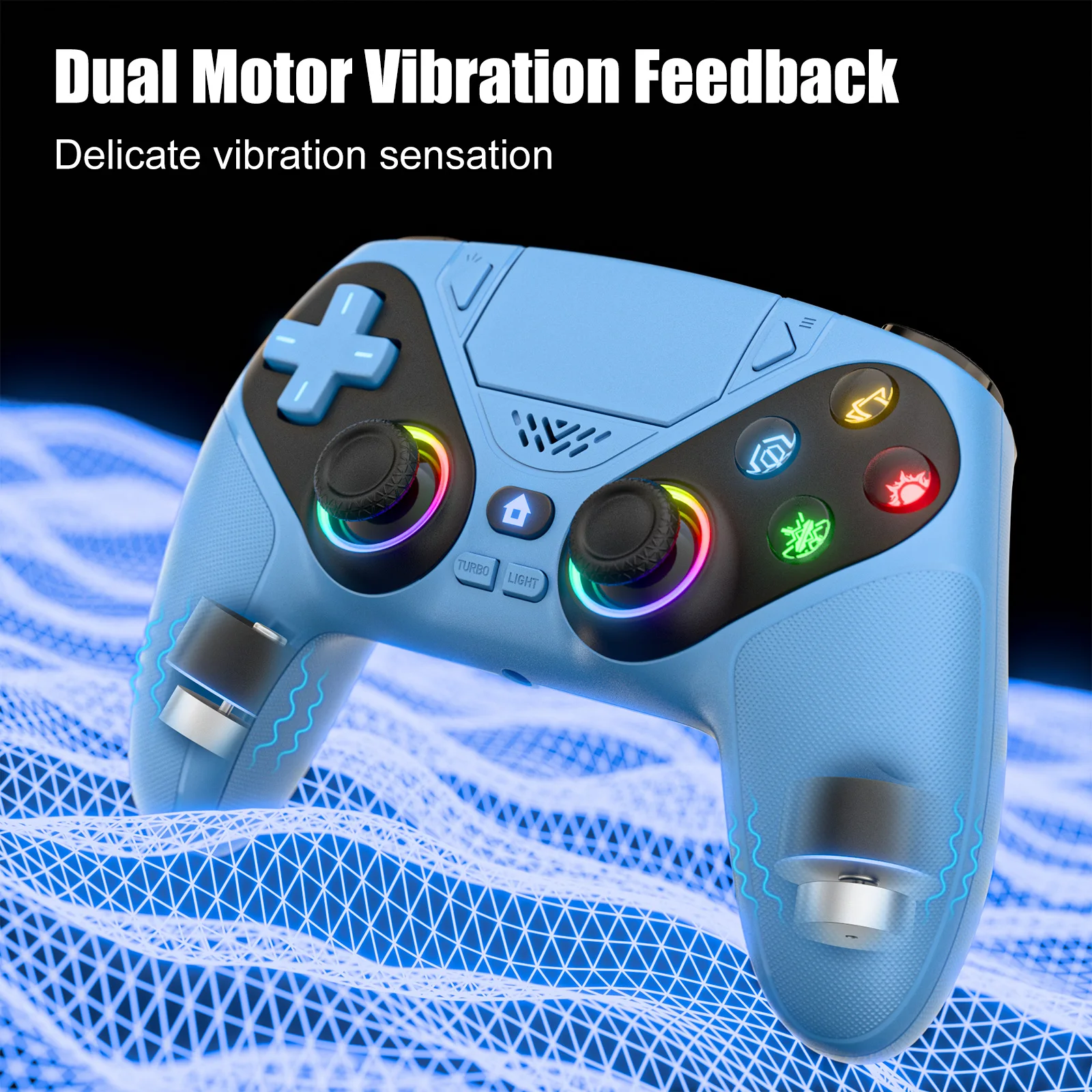 Este controlador de PS5 es compatible con PS5 y PC con Windows, presenta una configuración sencilla y un chip Bluetooth 5.3 incorporado para una conectividad estable y sin latencias.Incluye iluminación RGB personalizable con múltiples modos.Equipado con joysticks y botones 3D de alta calidad para un control preciso, también tiene dos botones traseros personalizables y una función Turbo.El controlador cuenta con un giroscopio de seis ejes, motores de vibración duales, una batería recargable de 1000 mAh, un micrófono, un altavoz, un conector para auriculares de 3,5 mm y un panel táctil para una experiencia de juego inmersiva.