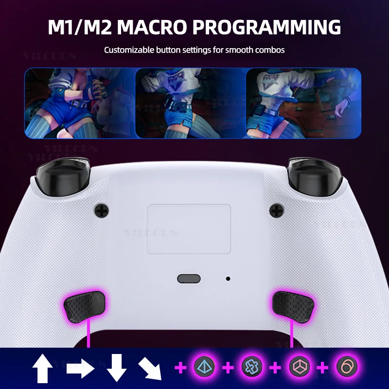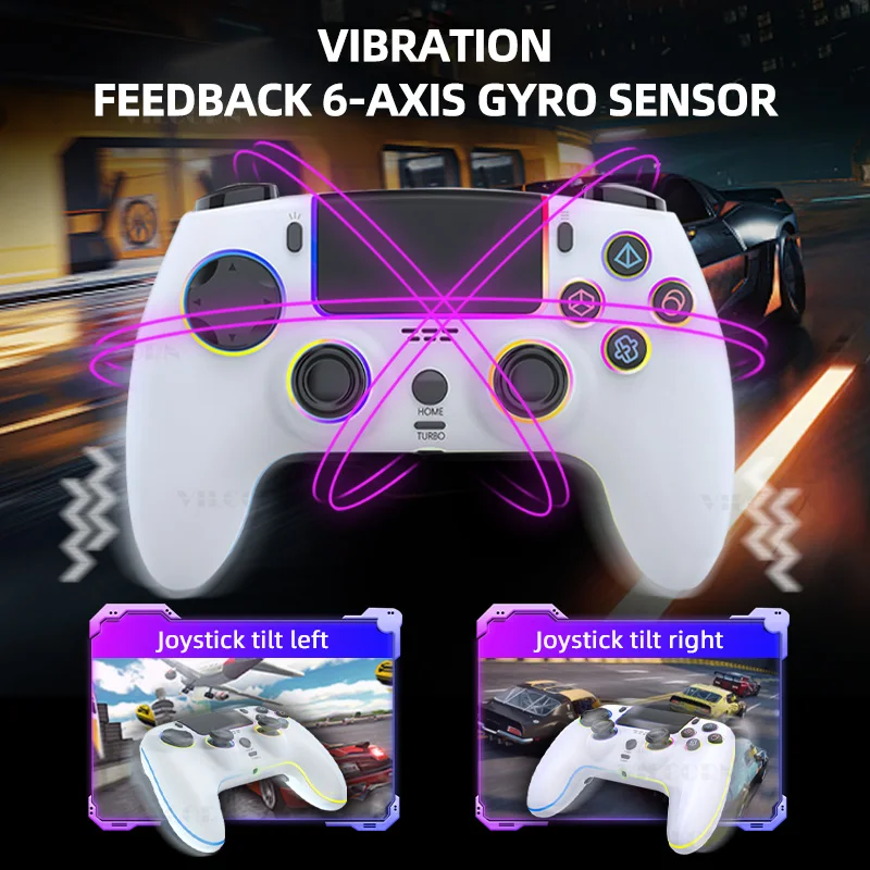El potente retroalimentación de vibración combinado con el sensor giroscópico de 6 ejes le permite sentir retroalimentación de escena más realista en los juegos.Por ejemplo, en un juego de carreras, el controlador vibrará según el estado de movimiento del vehículo, mejorando la inmersión del juego.
