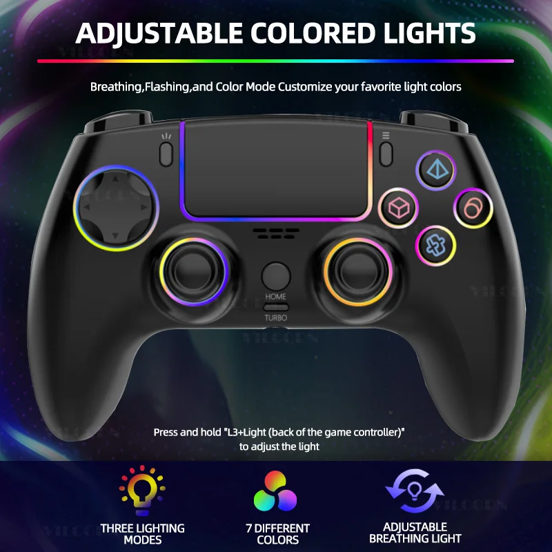 Cuenta con modos de respiración, parpadeo y color para personalizar tus colores de luz favoritos.Tiene tres modos de iluminación, siete colores diferentes y un efecto de luz de respiración ajustable, lo que hace que su controlador sea más elegante durante el juego.