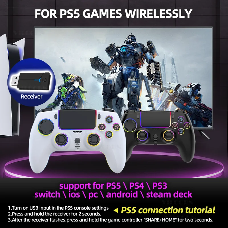 El proceso de conexión es sencillo.Para la conexión inalámbrica de PS5, debe activar la entrada USB en la configuración de la consola PS5, mantener presionado el receptor durante 2 segundos hasta que parpadee y luego mantener presionado el controlador de juego "SHARE + HOME" durante dos segundos.Para conexión por cable a otros dispositivos como computadoras, Switch, Android e iOS, puede seguir los pasos proporcionados, como ingresar a la configuración de accesorios del sistema y seleccionar la conexión del cable de datos USB.