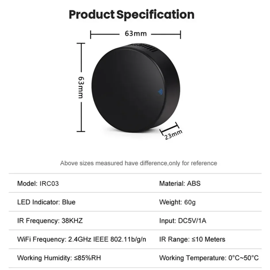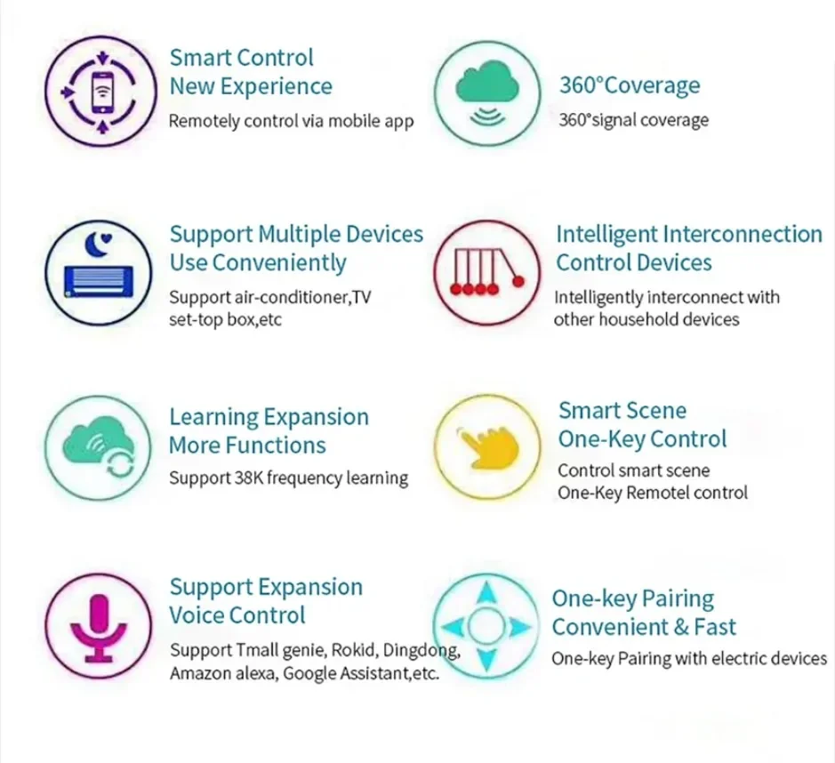 Dígale adiós al uso de controles remotos para cada uno de los electrodomésticos IR como TV, aire acondicionado, caja de TV, luz, ventilador, audio, etc.
