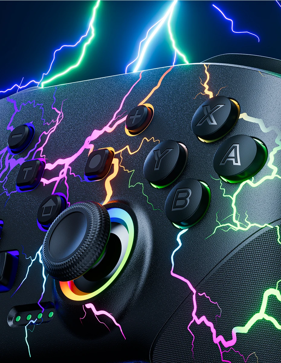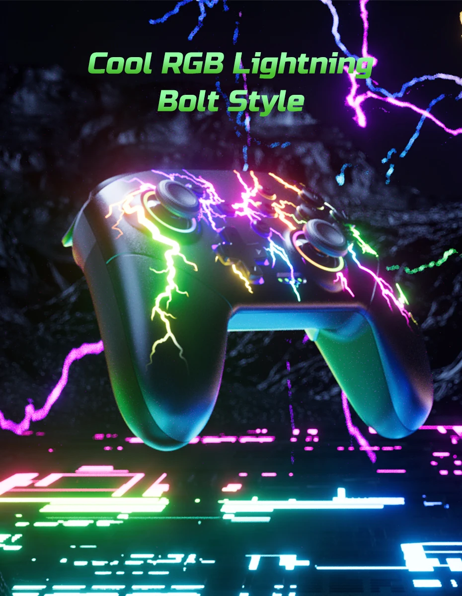 El patrón brillante estilo perno que aclara con 9 colores se ve realmente genial por la noche o en la oscuridad.4 modos de luz ajustables: luces sólidas, luces de respiración, luz LED estroboscópica RGB y LED apagado.Completamente cargada: 3-4 horas, Tiempo de funcionamiento: 10-15 horas; La batería dura muy bien y se carga rápidamente con un cable USB tipo C.Si está buscando un controlador de interruptor con un efecto de iluminación genial, este es el que necesita