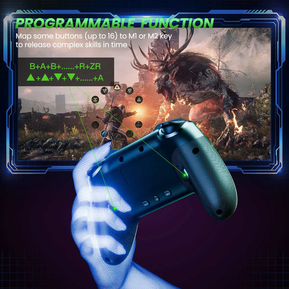 Los controladores de interruptor tienen botones adicionales, diseñados para simplificar operaciones de habilidades complejas con la tecla M1/M2 (M1/M2=cualquier tecla A/B/X/Y/L/ZL/R/ZR/L3/R3/D-pad, hasta 16 teclas).2 modos de programación: 1mapeo único 2 mapeo múltiple.Admite el modo Auto Turbo/Manual Turbo.3 velocidades de ráfaga ajustables: 5 disparos/s, 12 disparos/s y 20 disparos/s.El botón programable y Turbo maximizará el juego.