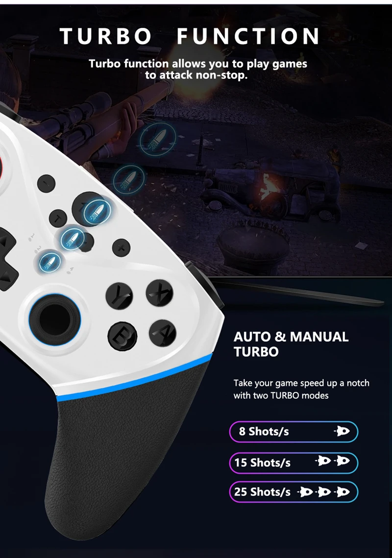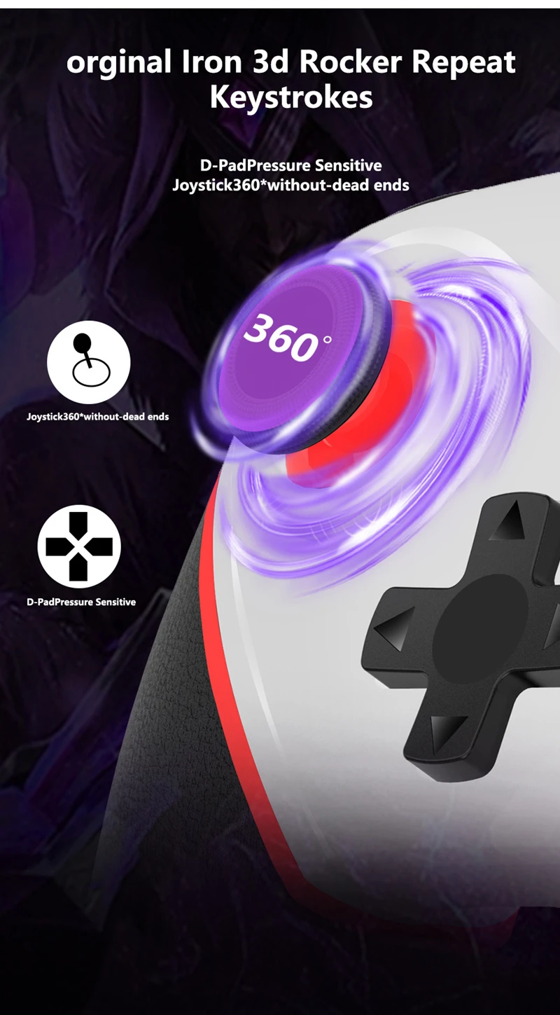 • Interfaz Bluetooth: Equipado con una interfaz Bluetooth, este controlador garantiza una conexión perfecta y sin demoras con su dispositivo, brindando una experiencia de juego inmersiva.