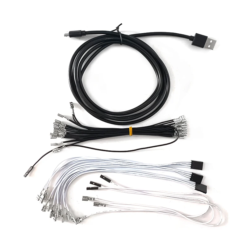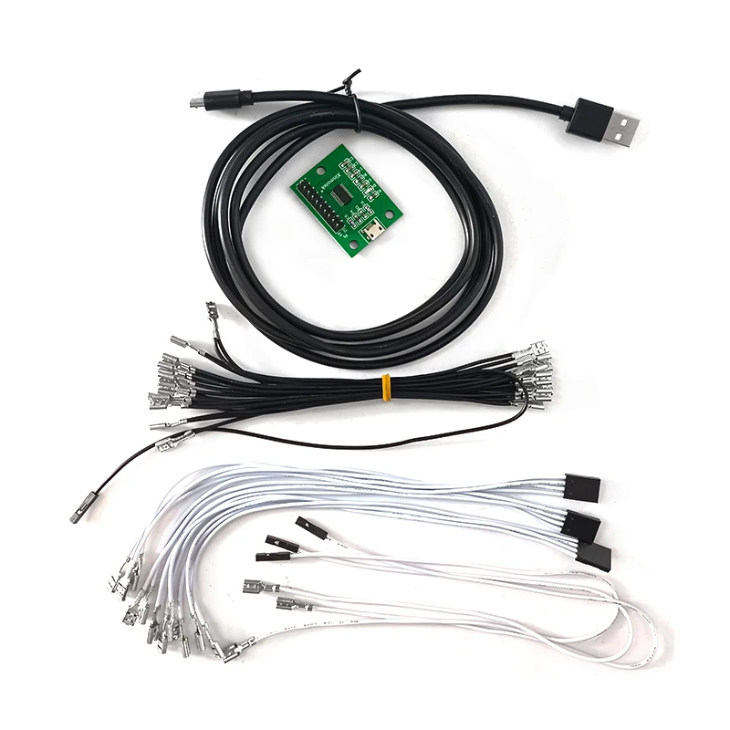 El precio incluye cableado con mazos y cable USB: 1 cable MicroUSB (1,8 M) + 10 cables de botón (tamaño 4,8 mm o 2,8 mm) + 1 cables de joystick.