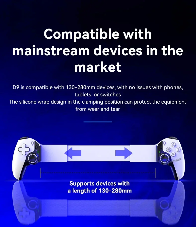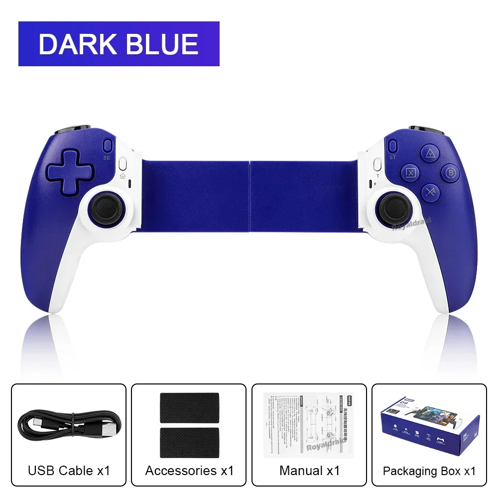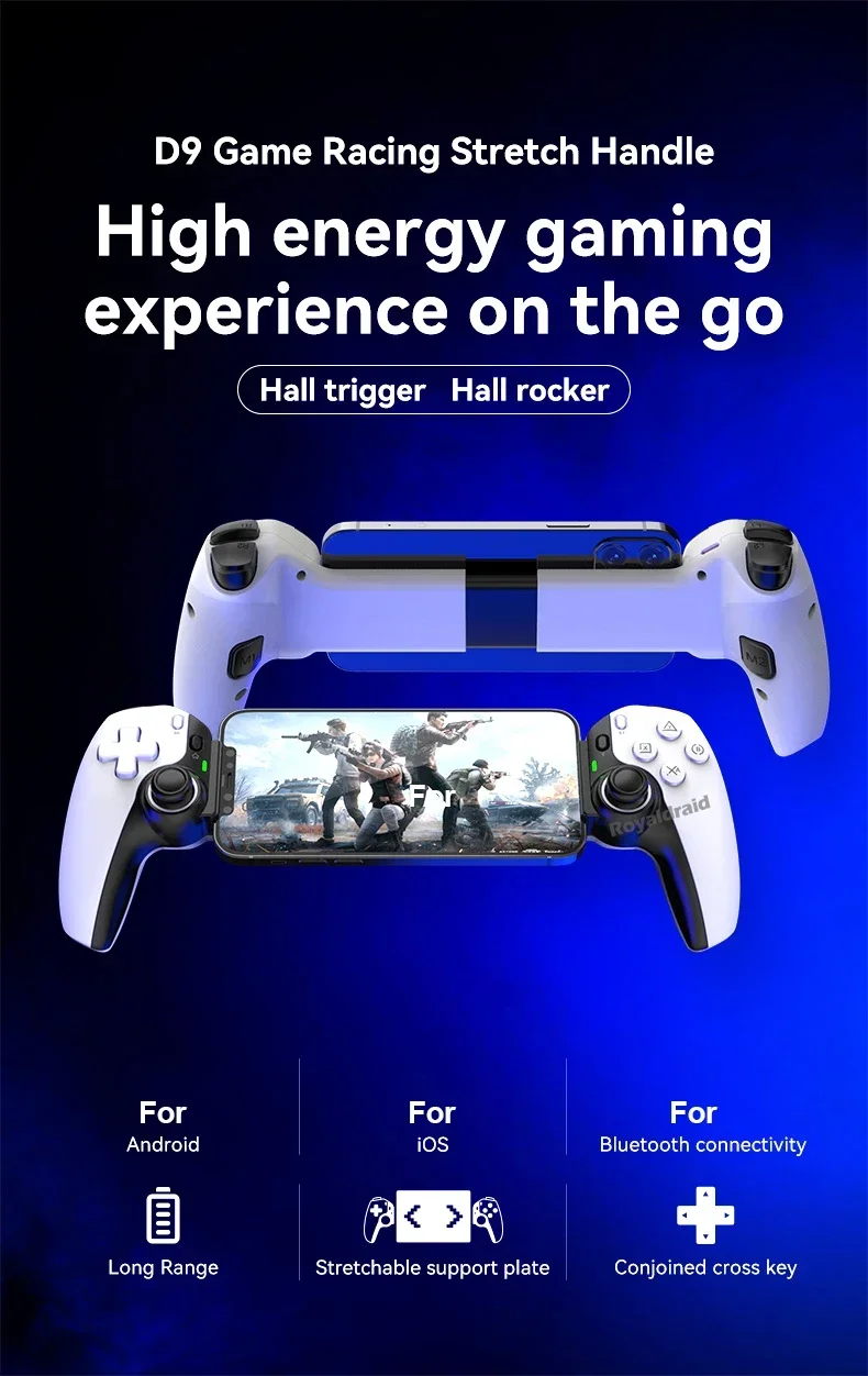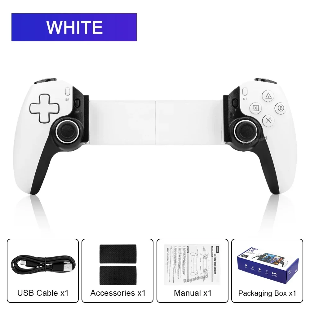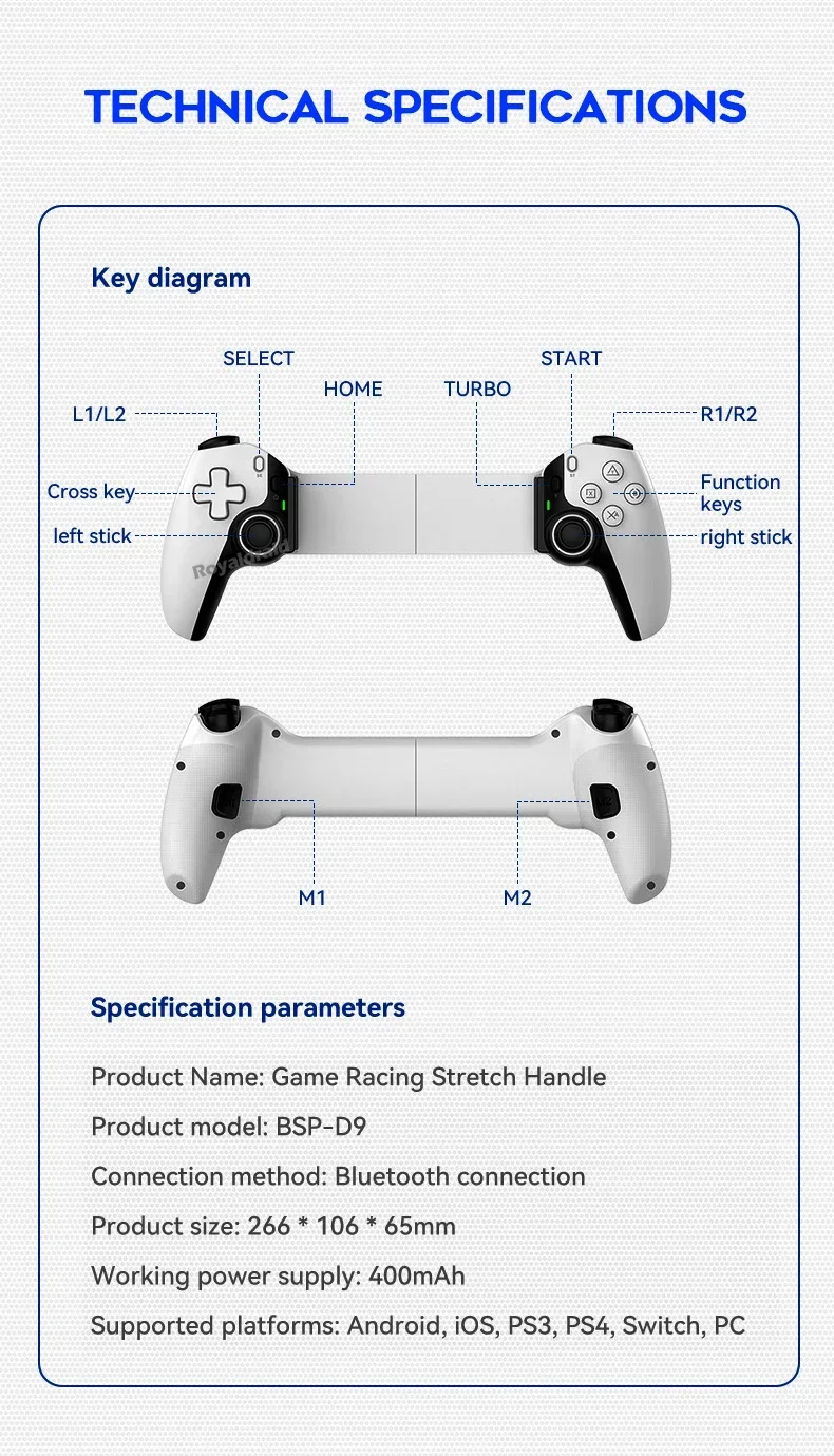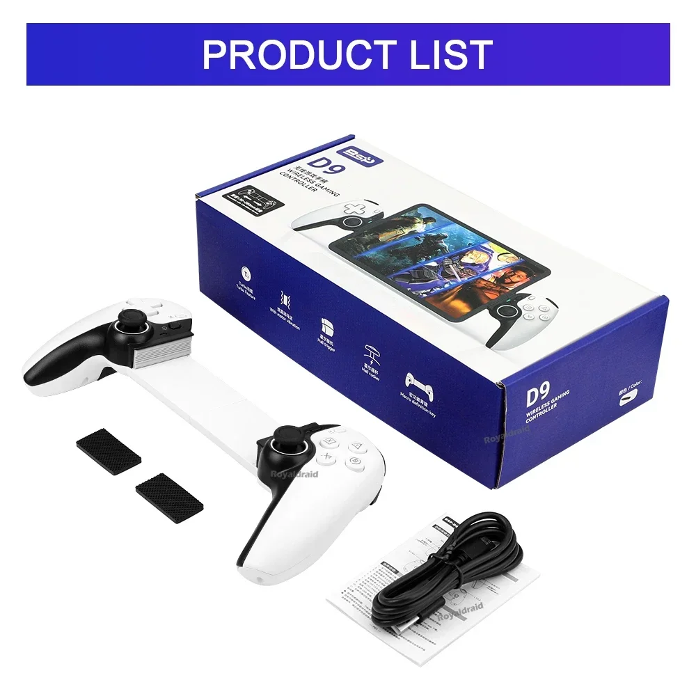 Controlador de juego de estiramiento de teléfono móvil D9, tableta de PC inalámbrica compatible con Bluetooth para Switch/P3/PS4, Control somatosensorial DualCaracterísticas:Controlador inalámbrico estirable D9 1.D9 compatible con PC/sistema Android/iosistema/tableta/PS3/PS4/switch.2.Gatillo Hall, balancín Hall: deriva cero, zona muerta cero, alta suavidad, alta capacidad de resistencia al daño, anillo resistente al desgaste.3.Vibración de doble motor, M1, M2 2 teclas traseras personalizadas.4.Silicona conductora ABXY, teclas cruzadas, agarre punteado antideslizante.5.Giroscopio de seis ejes, función de ráfaga con un clic.6.Admite la transmisión de juegos populares en PC, Xbox y consolas PS.7.Chip compatible con Bluetooth para juegos 5.2 de nueva generación de alta precisión con potente "núcleo" interno.8.Se puede estirar para admitir teléfonos móviles, tabletas y dispositivos Switch, y se puede estirar hasta una longitud de 130 ~ 280 mm.Especificación:Controlador de estiramiento competitivo para juegos D9: Modelo de producto: BSP-D9 Color: negro, blanco, azul, rojo (opcional) Método de conexión: mediante conexión compatible con Bluetooth Fuente de alimentación de trabajo: 400 mAh Plataformas compatibles: Aplicable para sistema Android/ios, para PS3/ PS4 /Cambiar/PC 1.Compatible con sistema Android/ios/PS3/PS4/Switch/PC; 2.El joystick Hall, el gatillo Hall, la tecla cruzada y el ABXY están diseñados con silicona conductora; 3.Admite programación macro, envío continuo con un clic y funciones asimétricas de motor dual; 4.Compatible con dispositivos, teléfonos móviles, tabletas e interruptores de 130-280 mm.El paquete incluye:1 * controlador inalámbrico de estiramiento D9(Para tabletas/ipad/teléfonos no están incluidos).1 * Cable tipo c1 * Manual de usuarioNota: 1.Debido a la diferencia de luz y pantalla, el color del artículo puede ser ligeramente diferente al de las imágenes. 2.Permita una ligera desviación en los datos de medición y asegúrese de que no le importe antes de realizar el pedido. 3. Si encuentra un paquete o productos dañados o faltantes, grabe un video claro para obtener el paquete completo y el peso real recibido, y contáctenos la primera vez. Así podremos resolverlo lo antes posible, gracias.