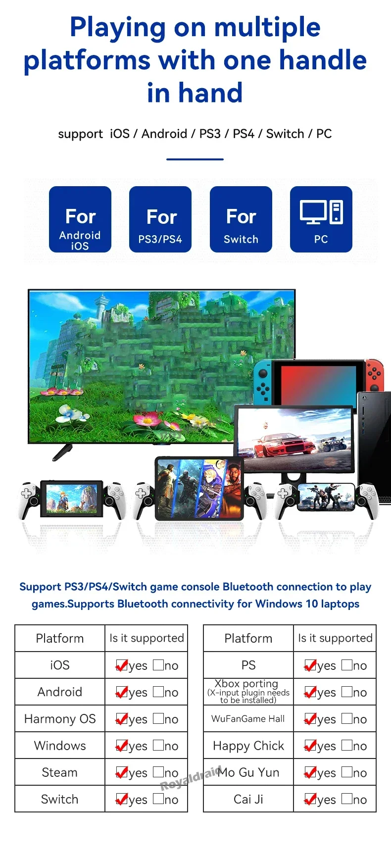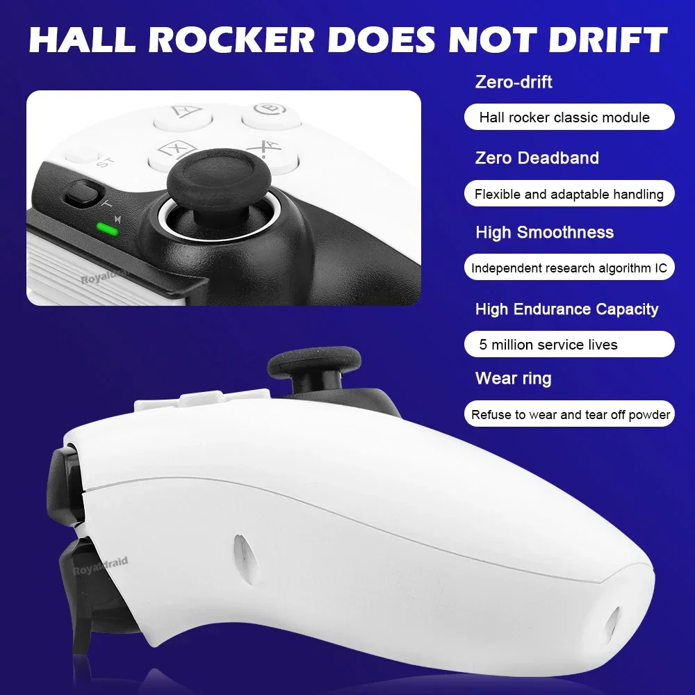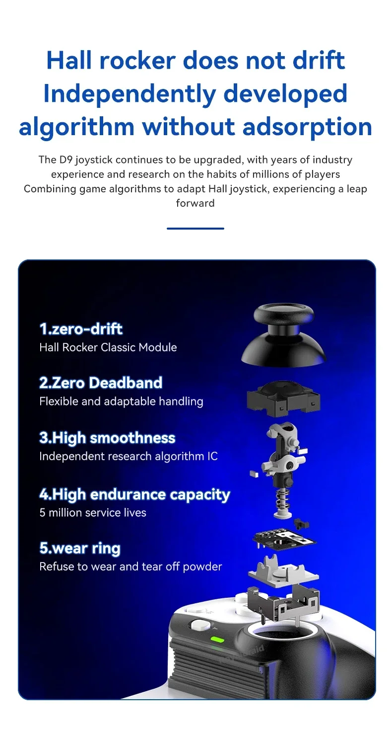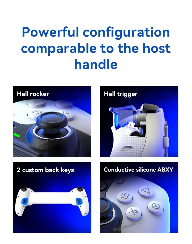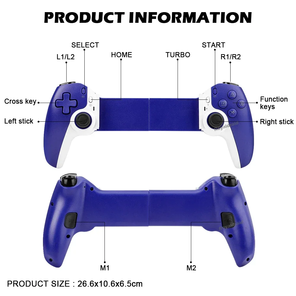 Controlador de juego de estiramiento de teléfono móvil D9, tableta de PC inalámbrica compatible con Bluetooth para Switch/P3/PS4, Control somatosensorial DualCaracterísticas:Controlador inalámbrico estirable D9 1.D9 compatible con PC/sistema Android/iosistema/tableta/PS3/PS4/switch.2.Gatillo Hall, balancín Hall: deriva cero, zona muerta cero, alta suavidad, alta capacidad de resistencia al daño, anillo resistente al desgaste.3.Vibración de doble motor, M1, M2 2 teclas traseras personalizadas.4.Silicona conductora ABXY, teclas cruzadas, agarre punteado antideslizante.5.Giroscopio de seis ejes, función de ráfaga con un clic.6.Admite la transmisión de juegos populares en PC, Xbox y consolas PS.7.Chip compatible con Bluetooth para juegos 5.2 de nueva generación de alta precisión con potente "núcleo" interno.8.Se puede estirar para admitir teléfonos móviles, tabletas y dispositivos Switch, y se puede estirar hasta una longitud de 130 ~ 280 mm.Especificación:Controlador de estiramiento competitivo para juegos D9: Modelo de producto: BSP-D9 Color: negro, blanco, azul, rojo (opcional) Método de conexión: mediante conexión compatible con Bluetooth Fuente de alimentación de trabajo: 400 mAh Plataformas compatibles: Aplicable para sistema Android/ios, para PS3/ PS4 /Cambiar/PC 1.Compatible con sistema Android/ios/PS3/PS4/Switch/PC; 2.El joystick Hall, el gatillo Hall, la tecla cruzada y el ABXY están diseñados con silicona conductora; 3.Admite programación macro, envío continuo con un clic y funciones asimétricas de motor dual; 4.Compatible con dispositivos, teléfonos móviles, tabletas e interruptores de 130-280 mm.El paquete incluye:1 * controlador inalámbrico de estiramiento D9(Para tabletas/ipad/teléfonos no están incluidos).1 * Cable tipo c1 * Manual de usuarioNota: 1.Debido a la diferencia de luz y pantalla, el color del artículo puede ser ligeramente diferente al de las imágenes. 2.Permita una ligera desviación en los datos de medición y asegúrese de que no le importe antes de realizar el pedido. 3. Si encuentra un paquete o productos dañados o faltantes, grabe un video claro para obtener el paquete completo y el peso real recibido, y contáctenos la primera vez. Así podremos resolverlo lo antes posible, gracias.