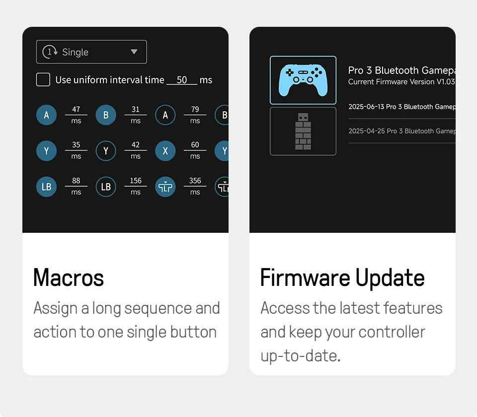 Ultimate Software le brinda el control de élite en cada pieza de su controlador.Personalice el mapeo de los botones, ajuste el joystick y la sensibilidad del gatillo, controle de vibración y cree macros con cualquier combinación de botones.Cree perfiles de controlador y cambie entre ellos en cualquier momento con el interruptor de perfil personalizado.*