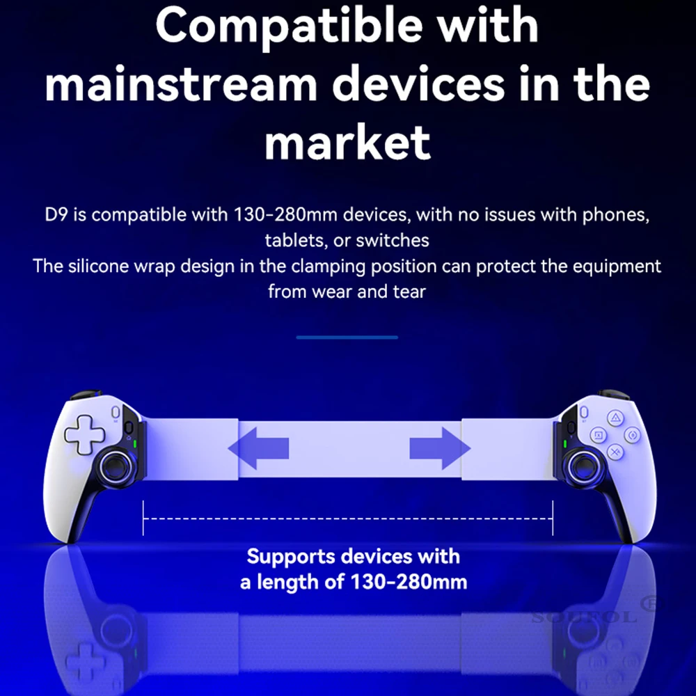 D9 es compatible con dispositivos de 130 ~ 280mm, sin problemas con teléfonos móviles, tabletas y Switch. El diseño envuelto en silicona de la posición de sujeción puede proteger el dispositivo del desgaste.