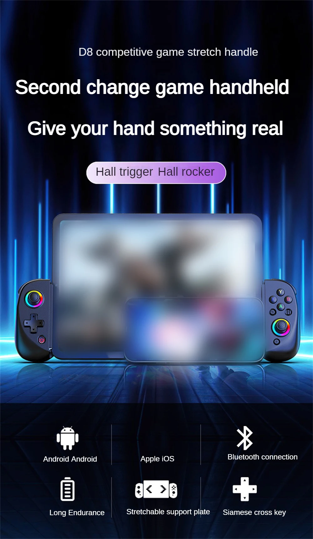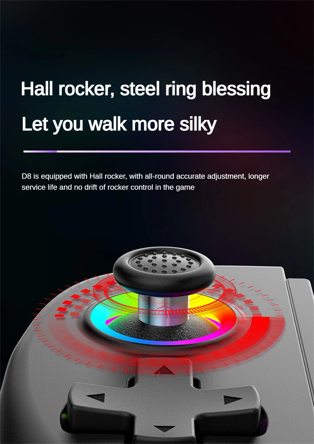 2. El D8 está equipado con un joystick Hall, que se puede ajustar con precisión en todas las direcciones, tiene una vida útil más larga y el control del joystick no se desplaza durante el juego.