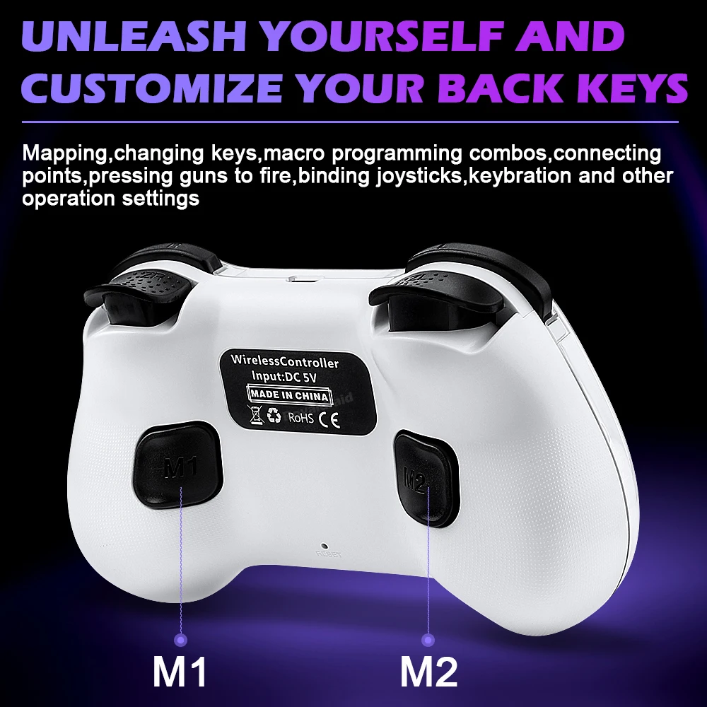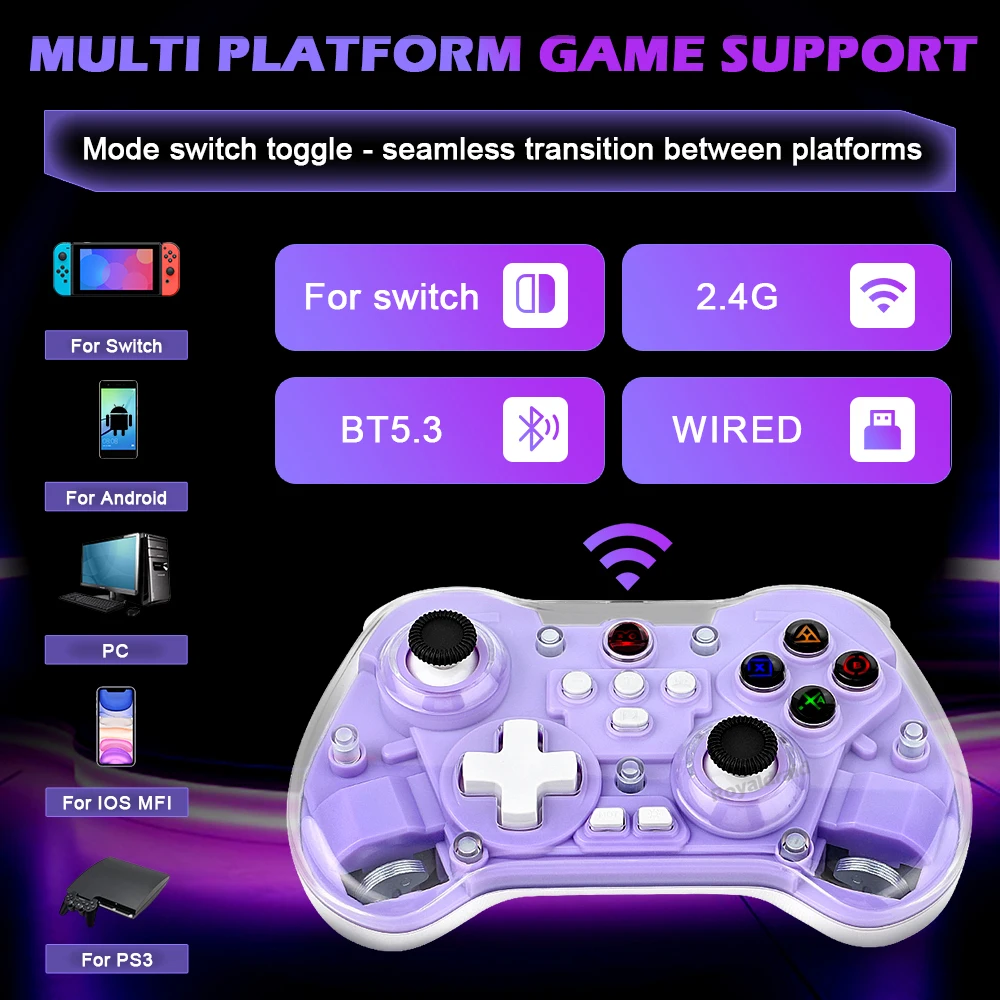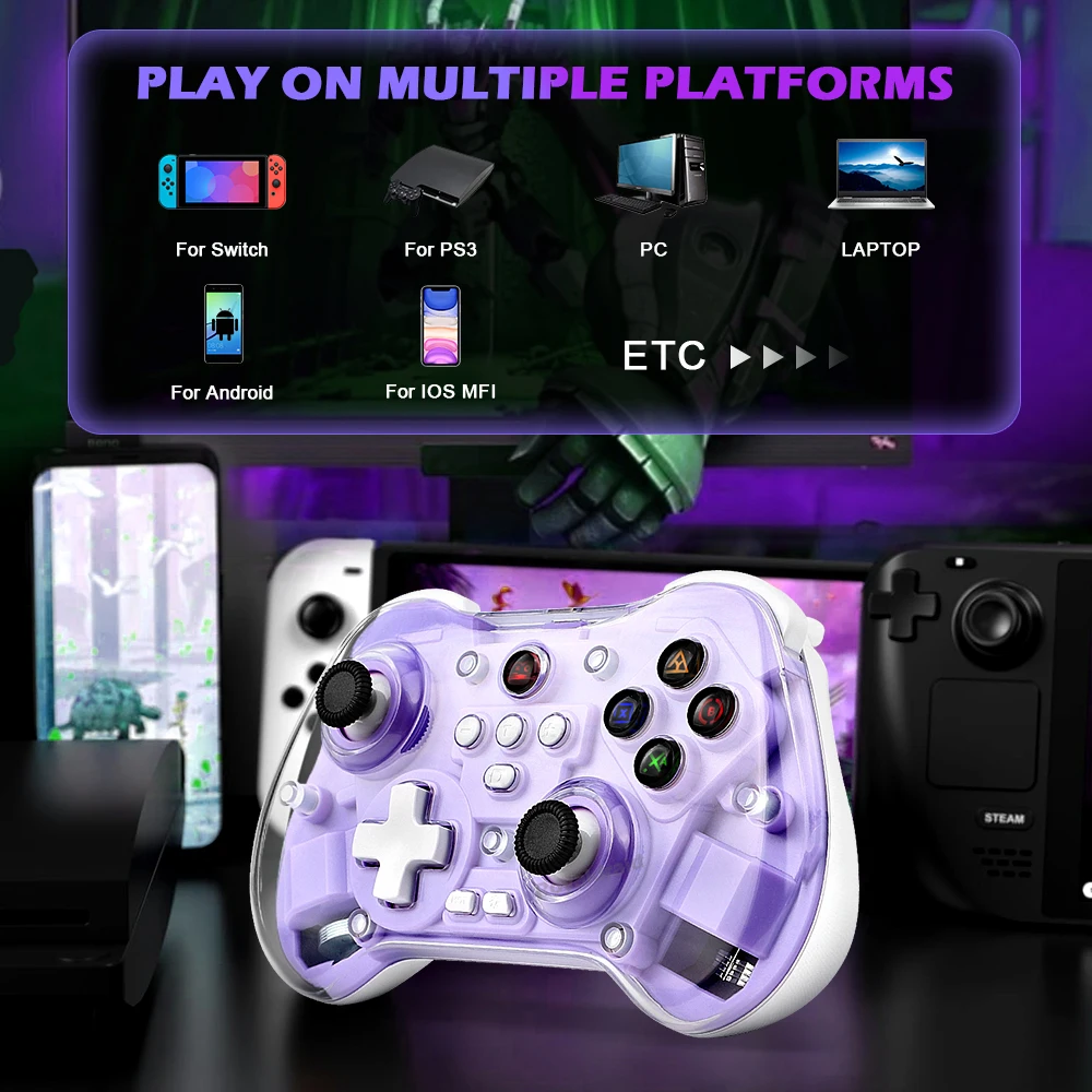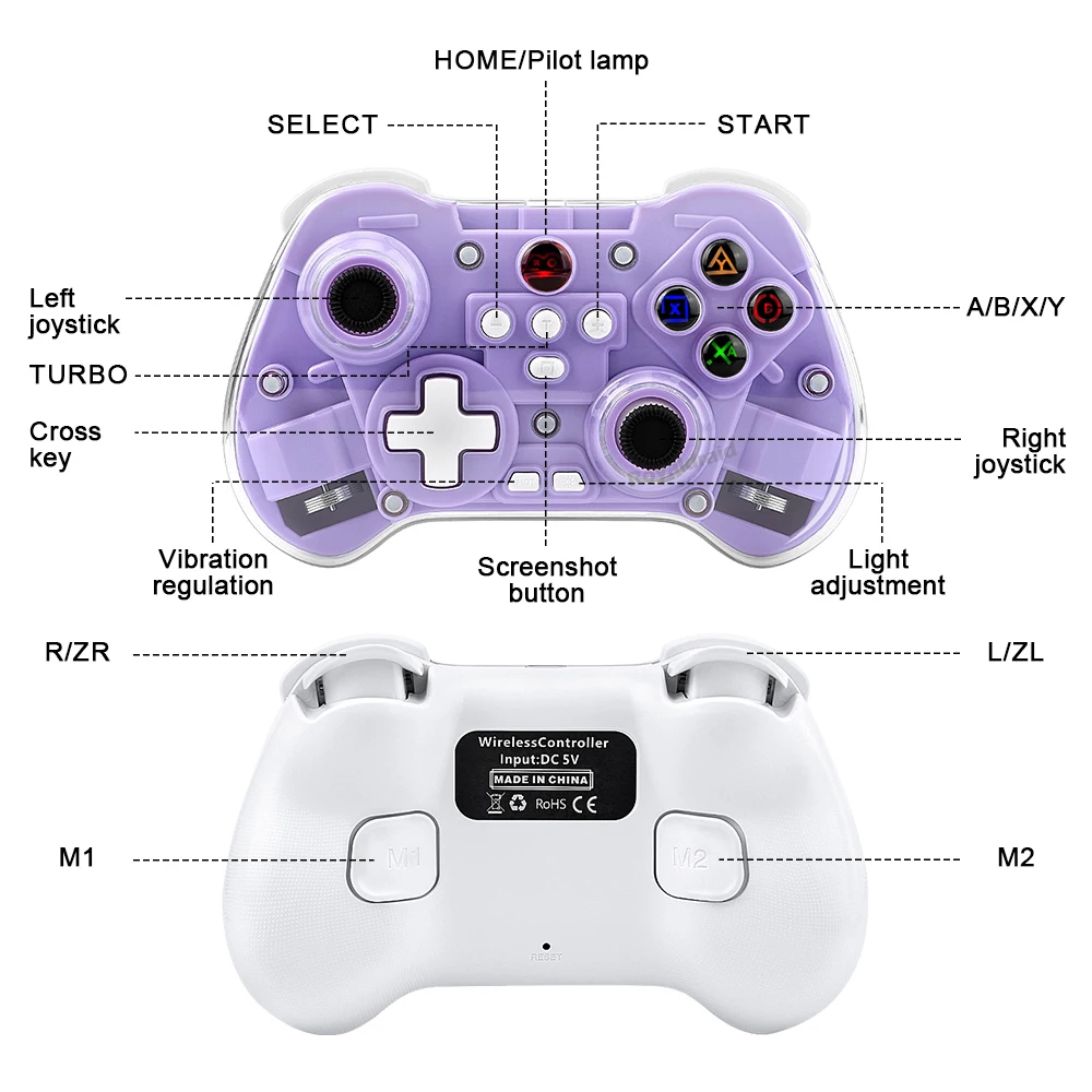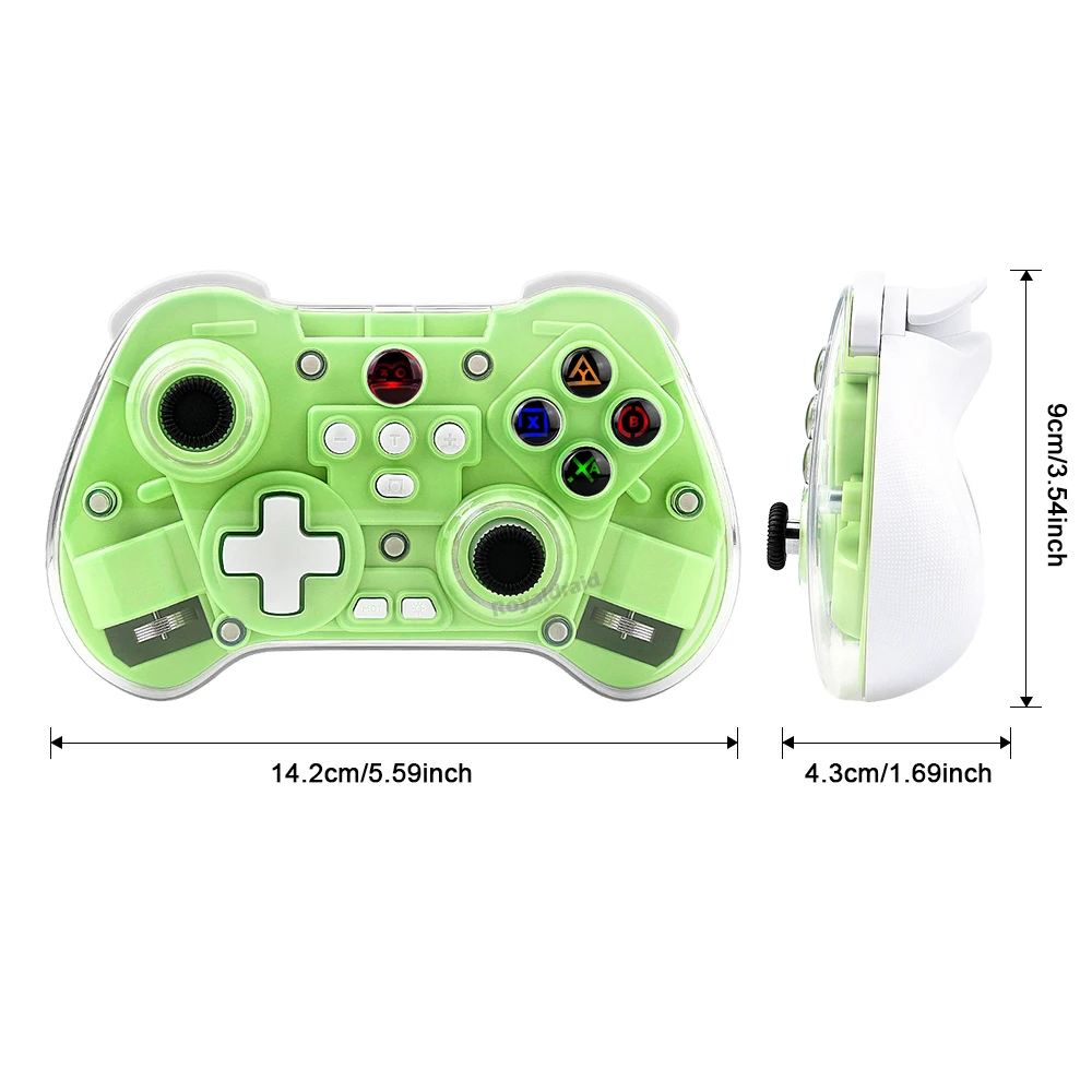 modname=ckeditor Controlador de juego inalámbrico transparente Z01X, Sensor de movimiento BT de 6 ejes, Joystick de pasillo programable Turbo para Switch/PC/iOS/Mac/AndroidCaracterísticas:Gamepad BT inalámbrico Z01X: 1.Admite múltiples plataformas: Switch, móvil/tableta, PC.2.Equipado con un joystick Hall; Disparador Hall; Botones de función adhesivo conductor con silicona elástica incorporada para garantizar un toque receptivo y disfrutar de un delicado placer de juego.3.Carcasa de superficie magnética transparente, estructura magnética de liberación rápida mejorada, reemplazable en cualquier momento, constantemente fresca.4.Equipado con teclas traseras de programación macro personalizadas, giroscopio con detección de movimiento de seis ejes, motor de vibración dual HD ajustable y transmisión continua TURBO con un solo clic.5.Wireless BT3.0 es un nuevo estándar de la industria que rompe limitaciones de espacio con menor latencia y mayor estabilidad en conectividad inalámbrica, lo que permite a los jugadores jugar donde quieran.Velocidad de retorno de hasta 800 Hz, con una experiencia operativa más delicada.7.Batería de larga duración, capacidad de la batería: 600 mAh, tiempo de uso continuo 10 horas.Distancia de transmisión BT 8 metros, voltaje de trabajo DC3.7V, corriente de trabajo 35mA.Especificación:Soporte de juegos multiplataforma para sistema NS Switch/PC/Android/iOS1.Voltaje de funcionamiento: CC 3,7 V 2.Corriente de trabajo: aproximadamente 10 mA 3.Tiempo de uso continuo: 20H 4.Corriente de sueño: 5uA 5.Voltaje/corriente de carga: DCSV/500mA 6.Distancia de transmisión Bluetooth:=8M 7.Capacidad de la batería: 400 mAh 8.Tiempo en espera: completamente cargado y izquierdo durante 60 díasLista de embalaje:1 * controlador de juego 1 * cable de carga CC USB 1 * Manual