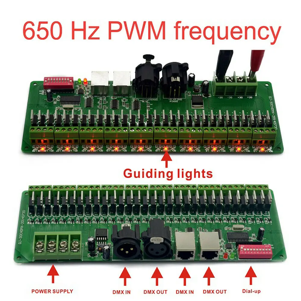 El controlador de decodificación DMX RGB de 24 canales funciona para convertir universal Señal digital DMX512/1990 a señal PWM, controlada por DMX512 Consola, con salida de escala de grises de 4096 niveles por canal.Adoptando, Tecnología de programación única, creación de desvanecimiento de color perfecto y exclamatorio. efecto suave, permite que el color del LED sea más rico simultáneamente
