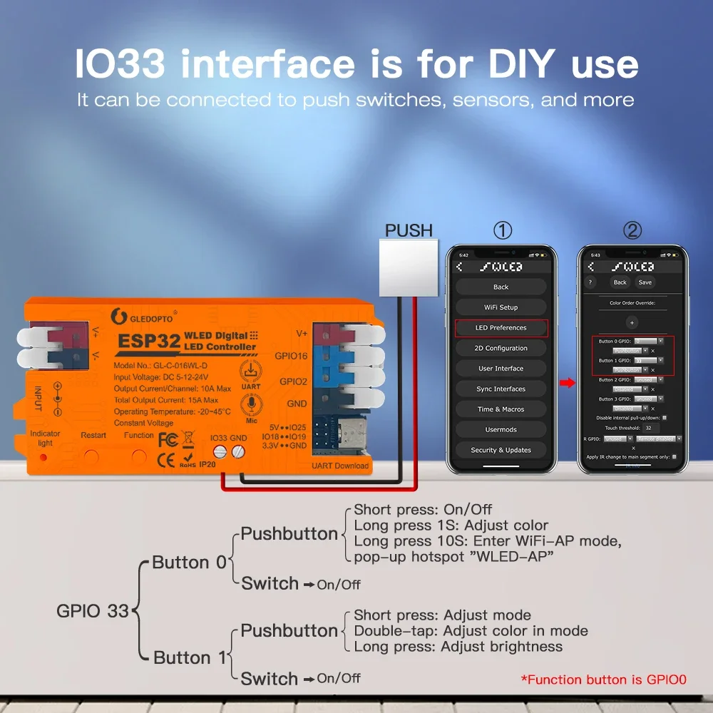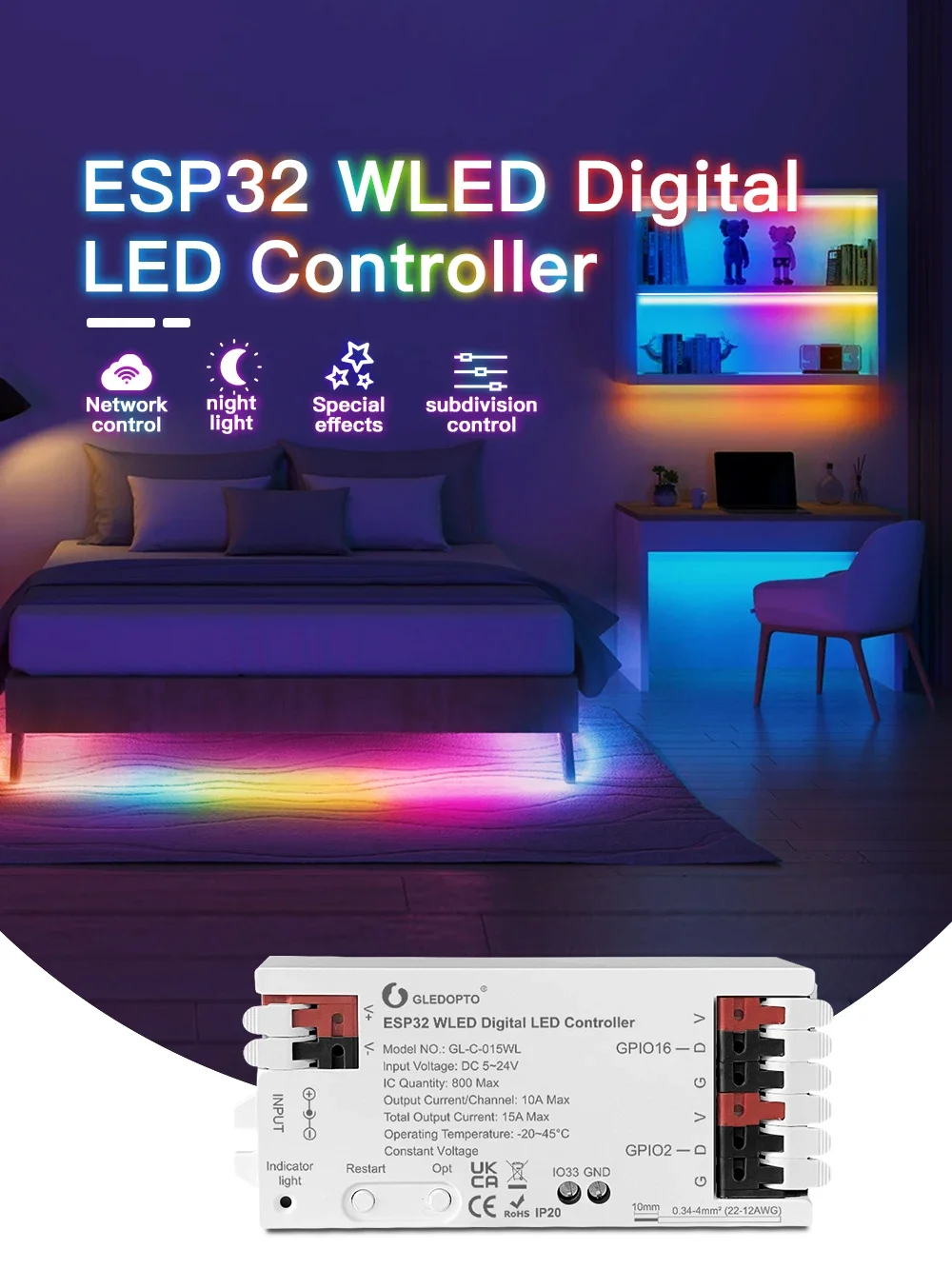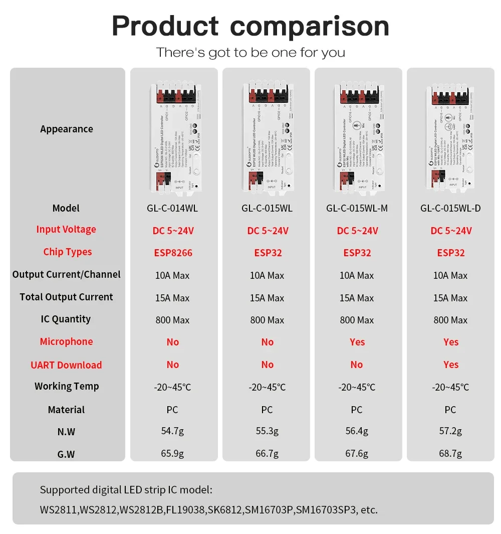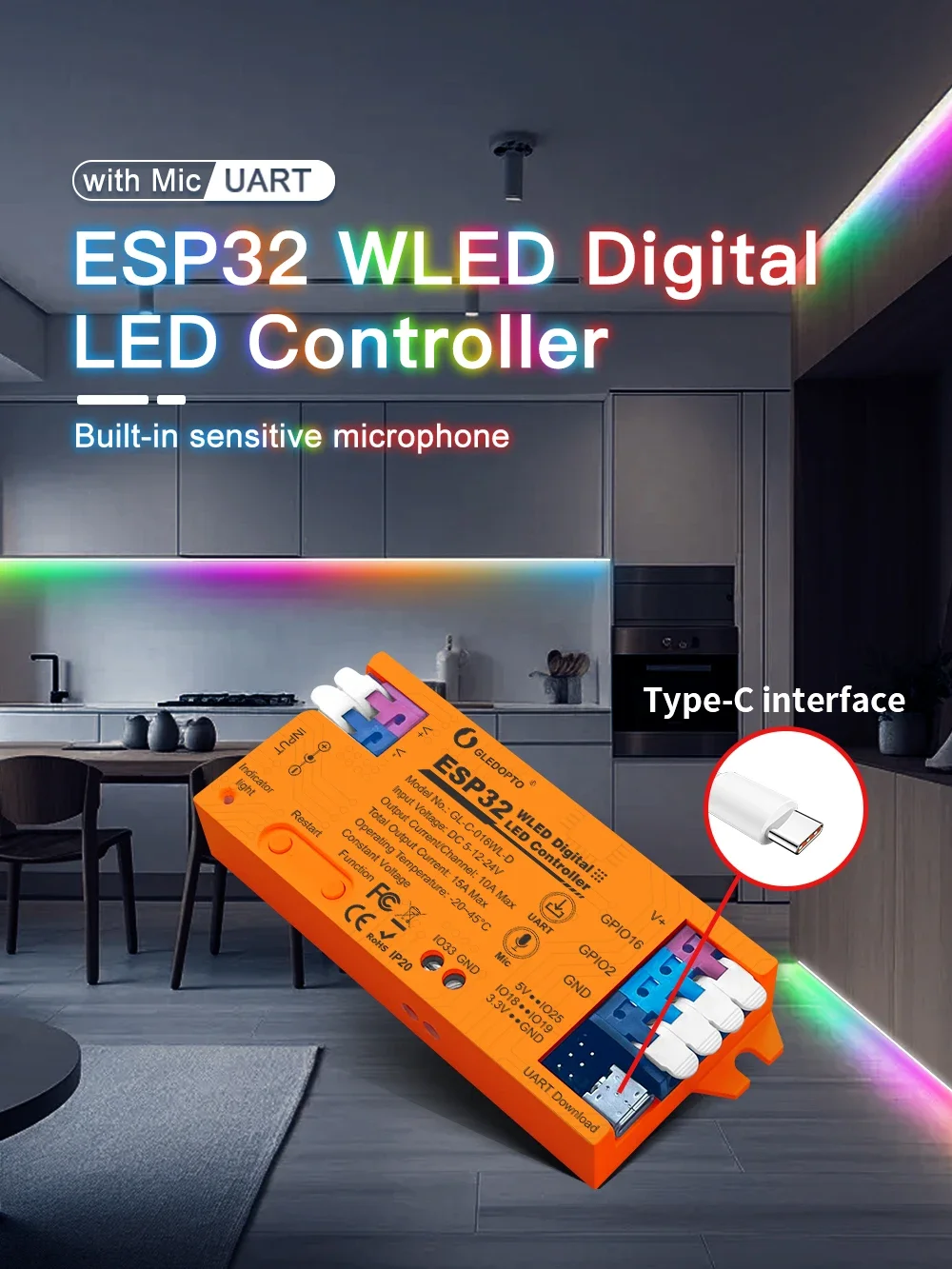 1 Uds Gledopto ESP32 ESP8266 WLED controlador LED aplicación iluminación dinámica DIY USB tipo C descarga Digital WS2811 WS2812 WS2815 SK6812 RGB IC tira de LED para micrófono