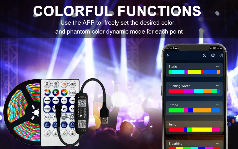 1.El teléfono móvil puede utilizar la aplicación para controlar y ajustar el color y el brillo de la tira de luz a través del bluetooth inteligente.