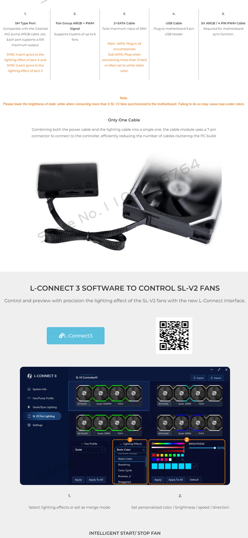 El producto probablemente proviene de un kit de tres ventiladores desmontado y revendido, ya que faltan todos los cables, como se ve en la foto, que estaban incluidos en el paquete original de Lian Li.