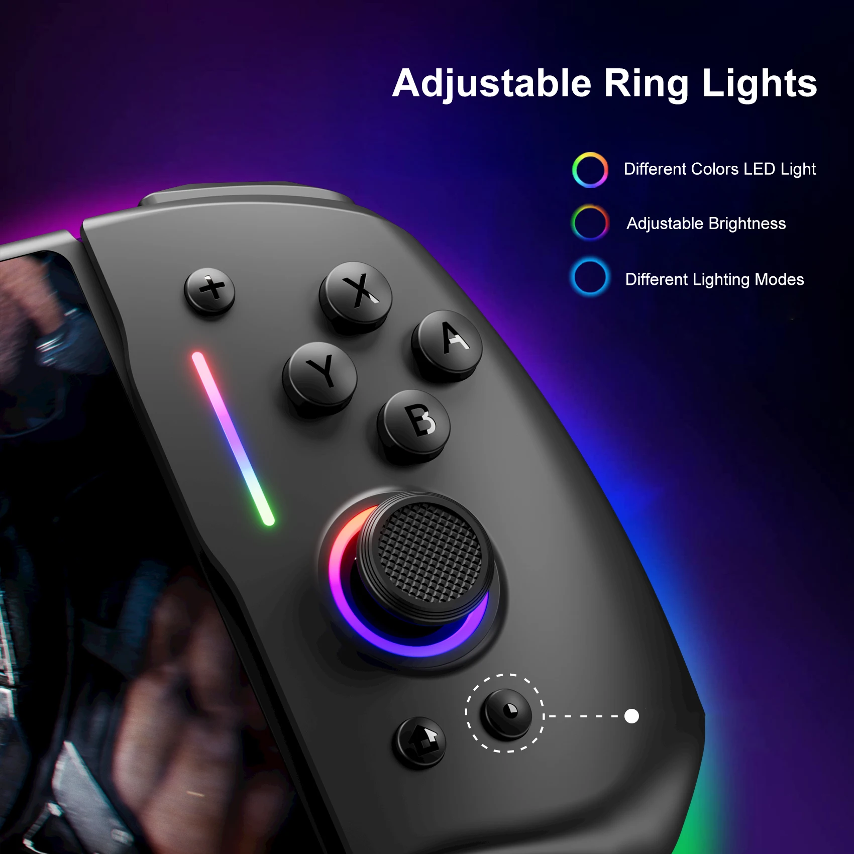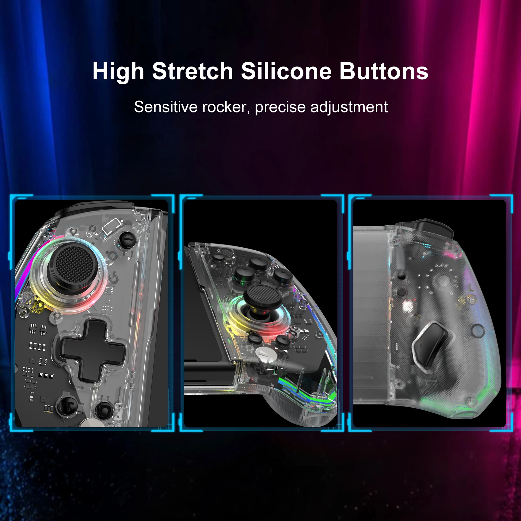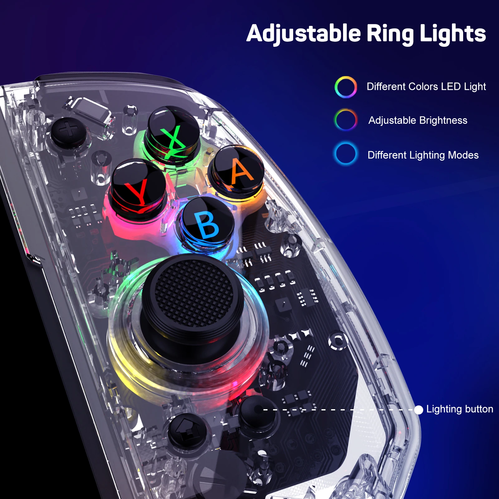 🎮【Diseño transparente y 8 luces RGB】El reemplazo del interruptor joycon presenta un diseño exterior transparente y fresco con ocho colores RGB, 4 modos de luz y brillo de luz ajustable.Presione el botón de luz para seleccionar una luz de un solo color, primero haga doble clic para seleccionar la respiración monocromática, el segundo haga doble clic para seleccionar la respiración del arco iris, el tercer doble haga clic para cerrar la luz.Especialmente la luz de respiración del arco iris, el controlador Joycon te brinda una atmósfera de juego fantástica cuando juegas.