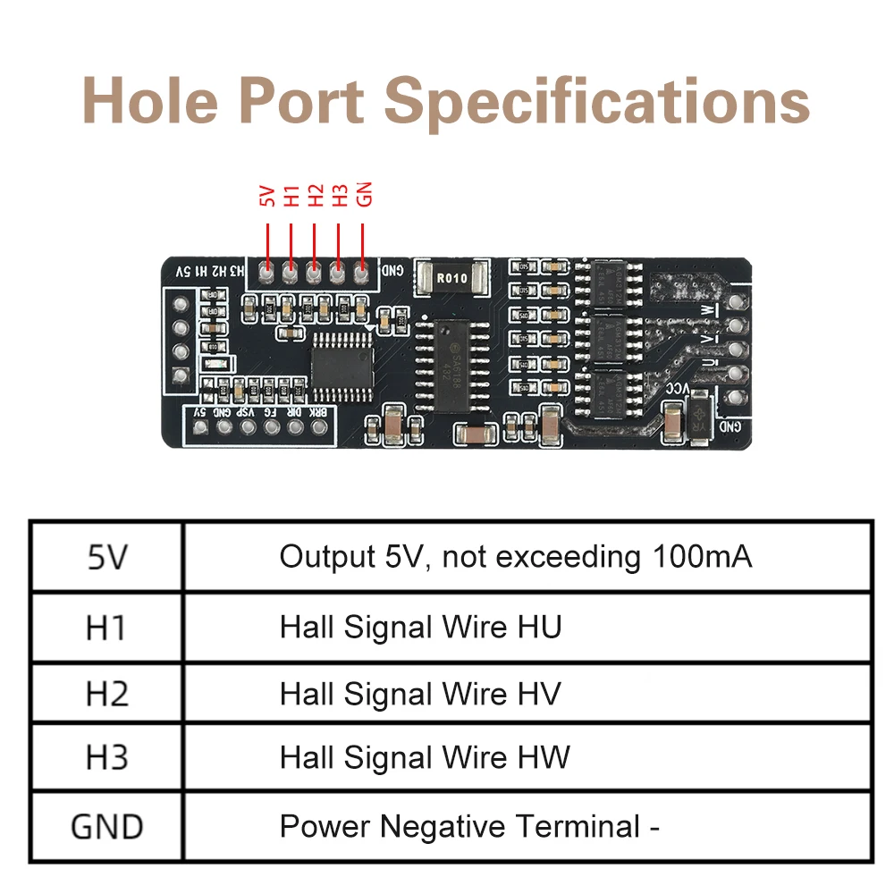 2.El módulo admite ángulos eléctricos del sensor Hall de 120 o 60 grados.La configuración predeterminada es para sensores Hall de 120 grados.Para motores con sensores Hall, conecte 5 cables: 2 para la fuente de alimentación del sensor Hall y 3 para señales del sensor Hall.Consulte las especificaciones del fabricante del motor o el código de color para distinguir y conectar los cables correctamente.Nota: Distinga entre cables del motor, cables de señal del sensor Hall y cables de alimentación del sensor Hall.