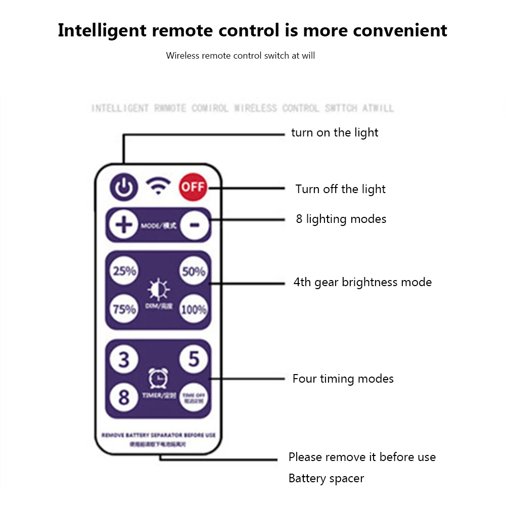 Instrucción: Viene con batería y caja de control integrada en panel solar.Con mando a distancia.El modo de iluminación se puede configurar mediante control remoto.