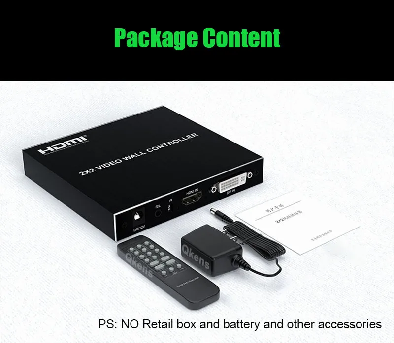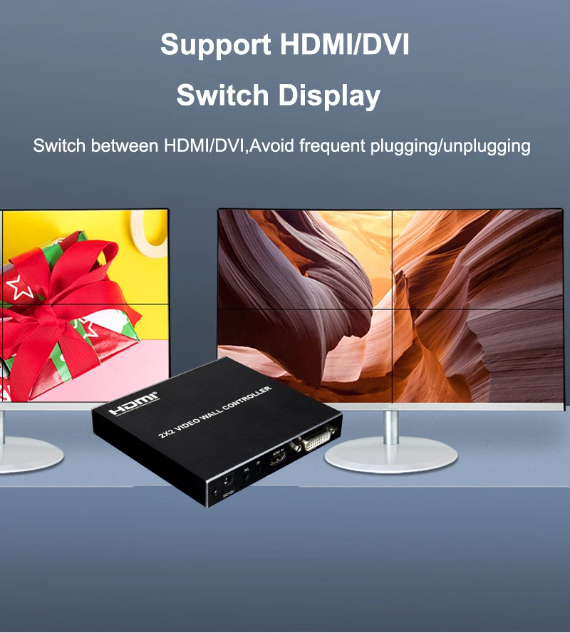Este controlador de pared de video 2x2, admite entrada HDMI o DVI y 4 salidas HDMI, la función principal es dividir a