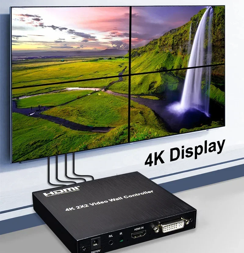 Este controlador de pared de video 2x2, admite entrada HDMI o DVI y 4 salidas HDMI, la función principal es dividir a