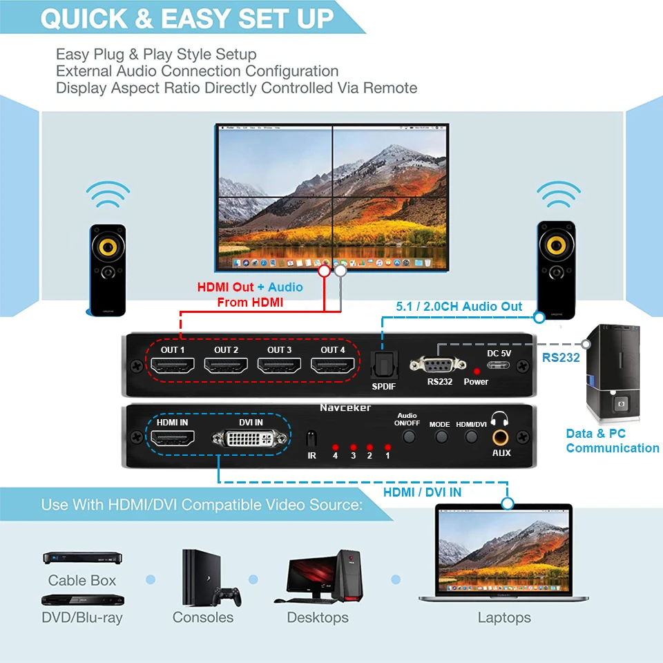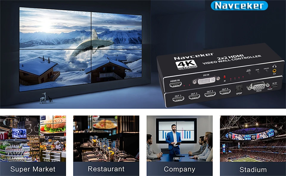 Controlador de pared de video HDMI: el procesador de pared HDMI TV puede distribuir un dispositivo de señal de entrada HDMI o DVI (DVD, TV Box, Xbox, Roku, computadora, etc.) a 4 salidas HDMI que muestran pantallas simultáneamente, que a través de pantallas de empalme LCD puede formar una pantalla de pared de video grande dinámica completa y pantallas de señalización digital, Brindarte una experiencia visual increíble. NOTA: Utilice las paredes de video profesionales en lugar de televisores.