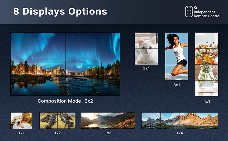 8 modos de visualización ajustables: este procesador de imagen de video HDMI 2x2 puede conectar hasta 4 televisores LCD u otras pantallas, que pueden admitir múltiples modos de visualización, como 2x2, 1x1, 1x2, 1x3, 1x4, 4x1, 3x1, 2x1. Todos estos modos proporcionan una variedad de opciones de empalme, puede cambiar fácilmente los modos a través del control remoto IR sin levantarse o presionar la tecla "Switch" en el controlador de pared del televisor. También admite control remoto avanzado RS 232.