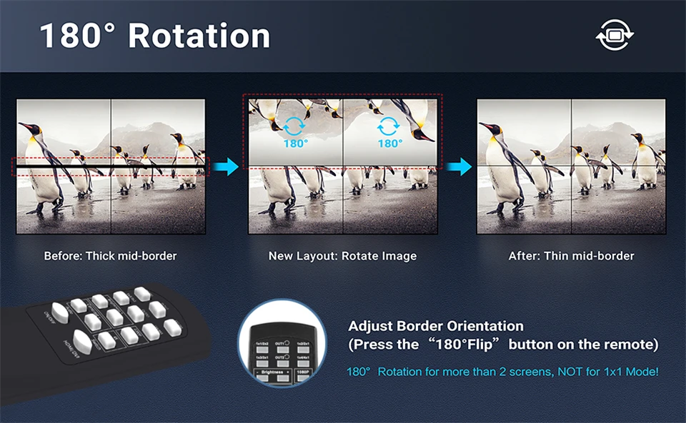 Si desea utilizar la rotación de 180 °, hay dos condiciones. 1. Modo 2x2, significa que necesitas 4 pantallas. 2. Sus dispositivos de entrada y salida no deben estar a más de 1080P @ 60HZ. Si sus dispositivos de salida son 4K, ajústelo a 1080P.