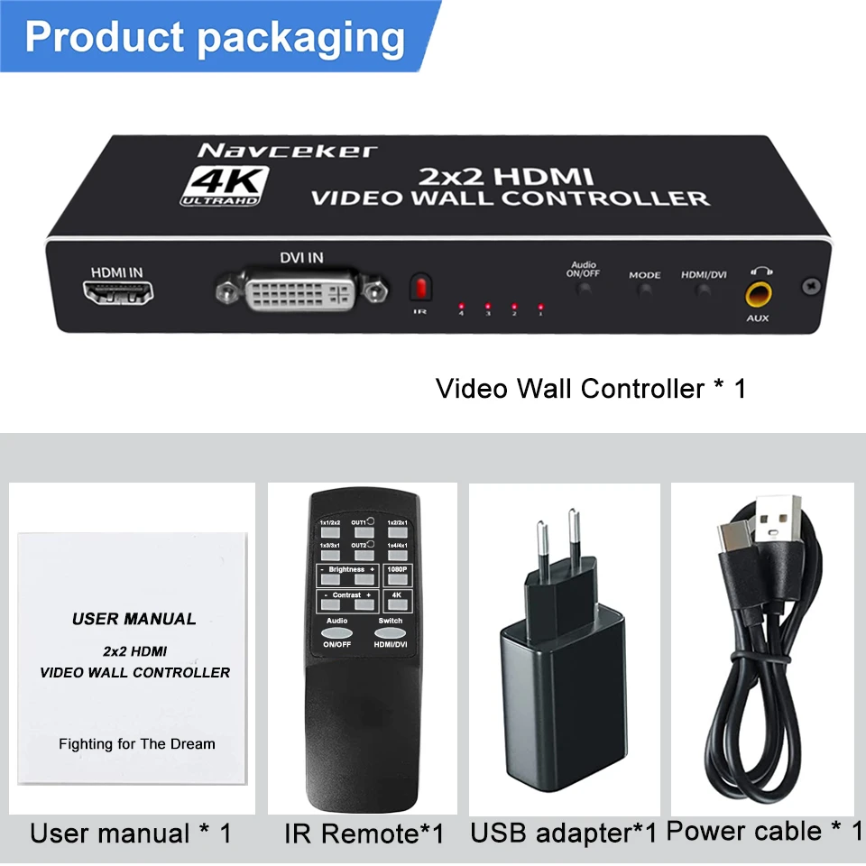 Controlador de pared de video HDMI: el procesador de pared HDMI TV puede distribuir un dispositivo de señal de entrada HDMI o DVI (DVD, TV Box, Xbox, Roku, computadora, etc.) a 4 salidas HDMI que muestran pantallas simultáneamente, que a través de pantallas de empalme LCD puede formar una pantalla de pared de video grande dinámica completa y pantallas de señalización digital, Brindarte una experiencia visual increíble. NOTA: Utilice las paredes de video profesionales en lugar de televisores.