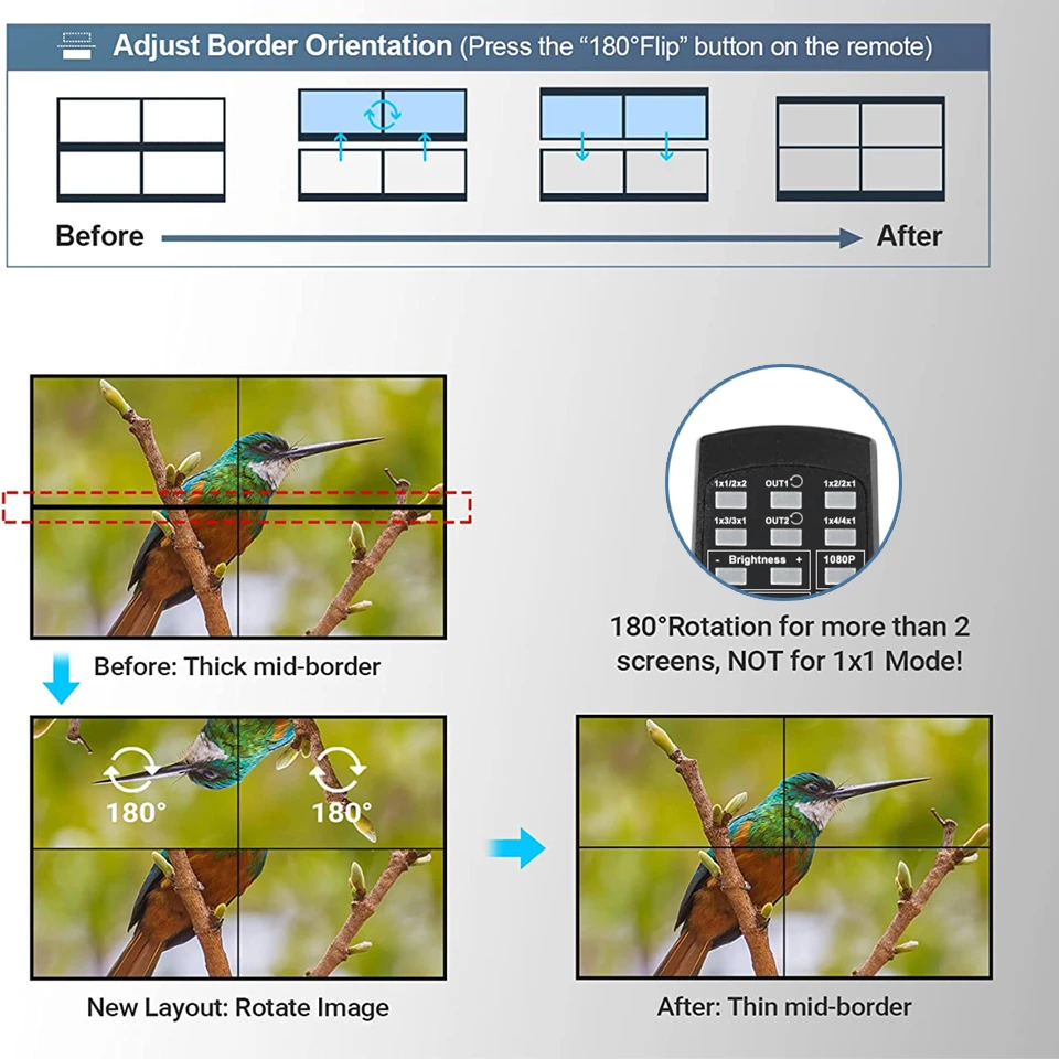 Rotación de pantalla de 180 ° y máscara de borde: Con la función de rotación, puede voltear la imagen de la salida HDMI 1 y la Salida 2 a 180 grados, que puede ajustar las pantallas en una orientación con los bordes más delgados, reduce el borde medio grueso. Y la función de máscara de borde puede corregir y alinear los biseles y los bordes de la imagen, haciendo que las múltiples pantallas sean más cómodas. NOTA: La rotación de 180 ° solo puede funcionar en modo 2x2, y las resoluciones de salida NO son superiores a 1080P @ 60Hz.