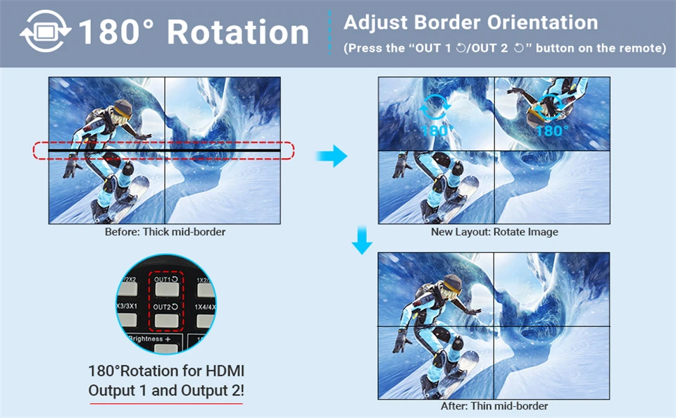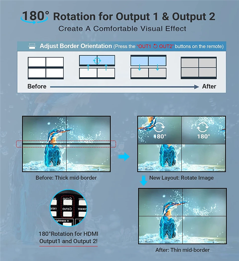 Rotación de pantalla de 180 ° y máscara de borde: Con la función de rotación, puede voltear la imagen de la salida HDMI 1 y la Salida 2 a 180 grados, que puede ajustar las pantallas en una orientación con los bordes más delgados, reduce el borde medio grueso. Y la función de máscara de borde puede corregir y alinear los biseles y los bordes de la imagen, haciendo que las múltiples pantallas sean más cómodas. NOTA: La rotación de 180 ° solo puede funcionar en modo 2x2, y las resoluciones de salida NO son superiores a 1080P @ 60Hz.