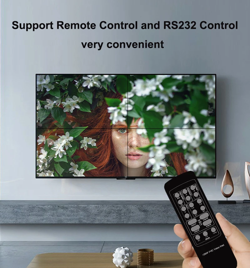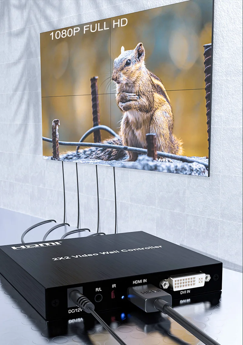 Este controlador de pared de video 2x2, admite entrada HDMI o DVI y 4 salidas HDMI, la función principal es dividir a