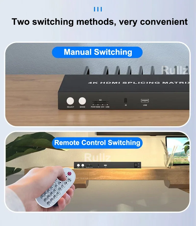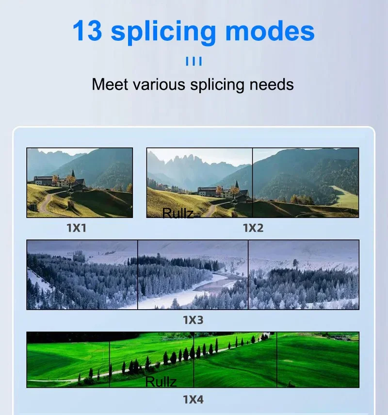 Como controlador de pared de video, admite la visualización de una sola imagen completa con HD múltiple Modos de empalme, compone una pared de video perfectamente sin ningún software de control, plug and play, Fácil de operar.