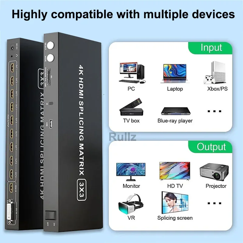 Nuevo y de alta calidad, ¡Compre con confianza! Este controlador de pared de video 3x3, admite 1 entrada HDMI/DVI y 9 salidas HDMI, el principal La función es dividir una sola señal de imagen HDMI HD completa en 9 unidades de visualización (Pantallas de retroproyección, TV LCD, etc.), para que formen una gran pantalla de imagen dinámica.