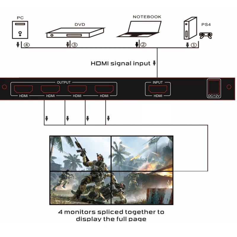 Completa HDMI, señal de imagen HD en 4 bloques y asignar a 4 unidades de visualización de vídeo (como la unidad de proyección trasera,